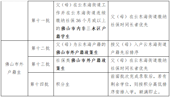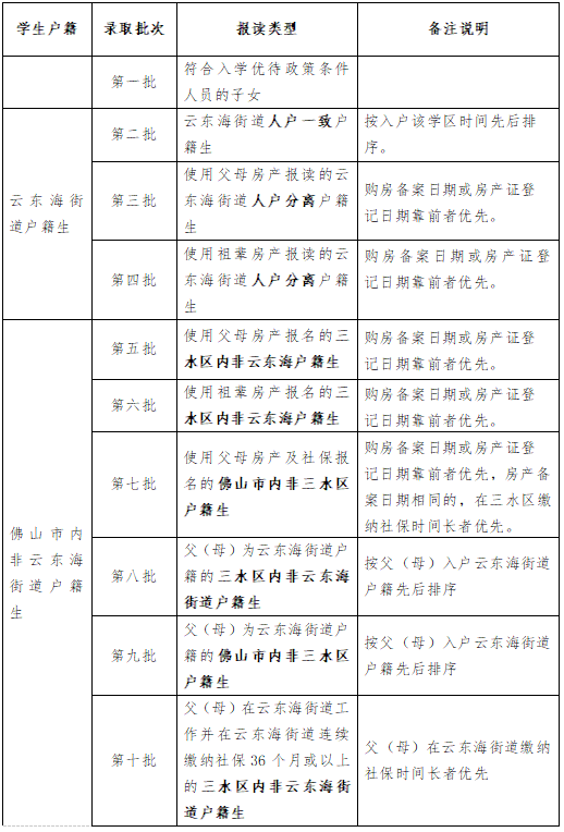 1.在公示确定的录取名单中,按批次顺序依次安排学位,前一批次的学生全部安排学位后,再安排后一批次的学生。同批次内同级志愿,优先安排学区招生范围内学生。如个别学区同批次的学生未能全部录取,余下未能录取的由街道教育部门调剂安排至其他学区入读,直至本批次的学生全部安排完毕后再按学区划分安排下一批次学生。录取结果以学校下发《注册通知书》为准,不服从安排或逾期未办理注册手续,视为自动放弃公办学位。2.关于申请“长幼随学”的学位安排。符合“长幼随学”政策的适龄儿童,将在同一录取批次内优先安排入读哥哥(姐姐)在读公办小学。3.2026年户籍适龄儿童数量较往年增幅显著,线上报名截止后迁入或未按时报名的户籍生(简称“迟报名户籍生”),在满足线上报名的学生入学需求后,由教育部门根据学位剩余情况统筹安排到街道内有剩余学位的学校就读。4.关于积分生学位问题。政策优待生、云东海街道户籍生、佛山市内非云东海街道户籍生、政策生完成录取后,若有剩余学位,则按积分派位,位满即止。具体的积分方案和积分办理指引,以云东海街道流动人口管理办公室的公告为准。预计2026年云东海街道公办学校剩余积分学位不多,请积分生做好回原籍就读或报读民办小学的计划。请有意申请积分入学的家长及时办理云东海街道的居住证并依时办理积分入学申请。