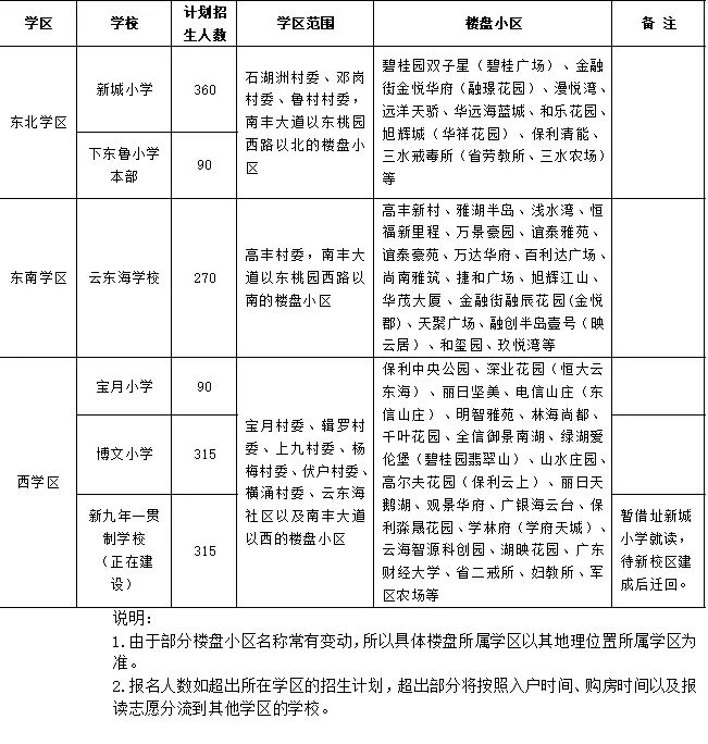 1.学区设置是为了相对就近安排入学,但并非绝对对应的关系。具体学位分配将根据学校学位数量、学生实际报名情况等因素统筹安排。2.根据数据测算,预计云东海街道2026年秋季学期适龄入学的人数依然处于学位需求高峰期,因此户籍生也不能保障一定能按报读志愿安排入读学区范围内对应的学校,请做好跨学区统筹学位安排的准备。3.因云东海街道户籍生“人户一致”(户口簿住址和报读学校学区一致)和“人户分离”(户口簿住址和房产住址不在同一学区,报读房产住址学区学校)的录取顺序不同,请同时具有“人户一致”和“人户分离”条件的户籍生注意学区的选择。4.由于新九年一贯制学校正在建设(地址:虹岭西路与云东海大道交界处东北侧,伏户流溪村旁),因此2026年秋季学期一年级新生仍需借址新城小学就读,待新校区建成后迁回,请报读的家长做好学生接送的规划。