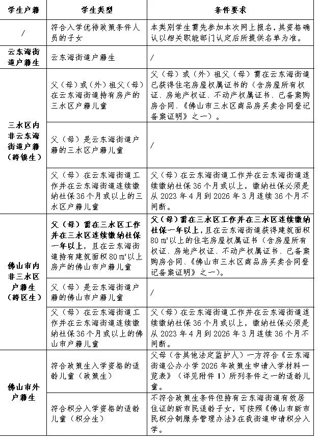 1、政策生:①符合云东海街道政策生入学条件的适龄儿童,在规定时间内报名的,保障入读云东海街道公办小学,由街道教育部门统筹安排学位;②学生与父母均为佛山市外户籍的,学生父或母必须持有三水区有效居住证才能报名,如果居住证正在办理延期签注手续的,要同时提供办理居(暂)住证历史记录和居住证换证的受理凭证;③社保类政策生的申请要求是学生父或母在云东海街道缴纳社保五年以上(含五年),且在三水区连续办理居住证五年以上(含五年),以上两个条件都需集中在父或母其中一方,时间从2021年4月到2026年3月连续60个月不间断。为保持政策延续,如居住证办理时限不符合要求的,可使用连续5年及以上营业执照或纳税证明作为“连续办理居住证5年及以上”的替代佐证材料。