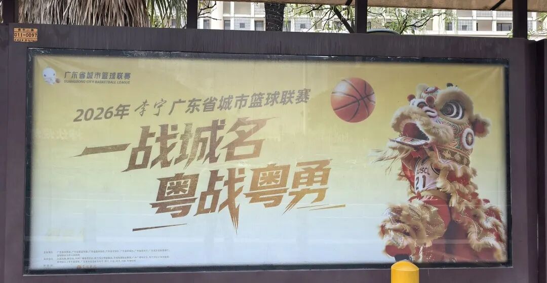 桂城21个公交站宣传栏也换上新装,醒目亮出“2026年广东省城市篮球联赛:一战成名 粤战粤勇”口号;海报融入醒狮、十五运会吉祥物“喜洋洋”“乐融融”等形象,尽显岭南特色与运动活力。