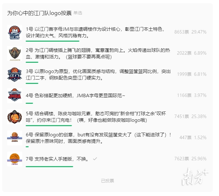 3月27日晚10时,粤BA江门队队徽全民票选结果出炉,1号以8653票胜出。