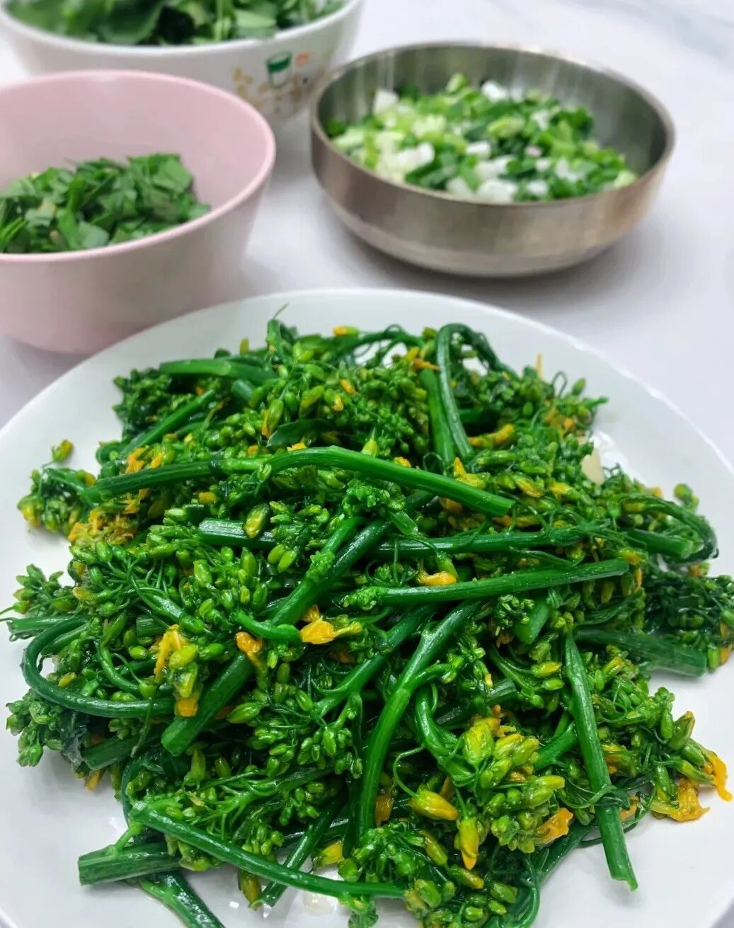油菜花是抚州赏花之旅中的大明星。取尚未完全开放的花苞和最嫩的茎尖,此时口感最佳。油菜花炒熟后依然保持翠绿,入口脆嫩,带有油菜特有的清香。