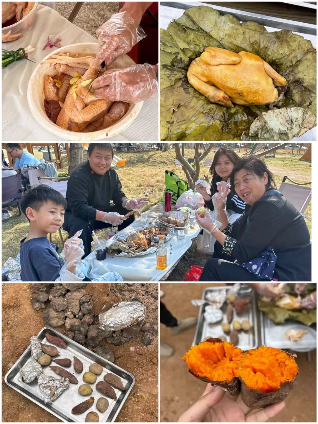 大人搬土垒窑,小朋友当助手,码好土块、留好通风口,敦实的土窑立起,盼着烟火慢煨出香。新鲜走地鸡裹上秘制调料,反复揉搓让香气渗进每一丝肌理,再裹上清香荷叶与锡纸锁鲜,待土块烧得通体赤红,便入窑密封。耐心等待间,荷叶的清润与鸡肉的醇香悄悄交融,漫出窑口、飘满林间;开窑瞬间,香气轰然炸开,焦香裹着荷香直钻鼻腔,金黄油亮的鸡皮微脆,轻轻一撕就“滋滋”冒汁,嫩到脱骨的鸡肉吸饱了窑火的暖香,搭配软糯流蜜的窑番薯、带着烟火气的玉米,每一口都香到跺脚!