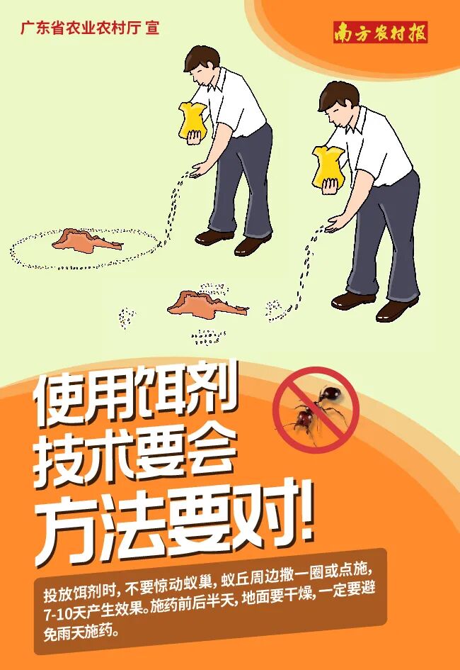 室外现场环节干货满满、实用性强。植保专家详细讲解了红火蚁蚁巢寻找、蚁巢辨别、红火蚁习性等专业知识,深入田间现场演示了饵剂施药,生动形象地展示了如何科学、高效地扑灭红火蚁,并与现场人员进行了互动和解答。来自南庄镇基层的一名技术员谈道:“我之前是将药直接撒在蚁巢上,这次看到专家是将药撒在蚁巢周边,诱导红火蚁搬进去,这样灭蚁更科学”。