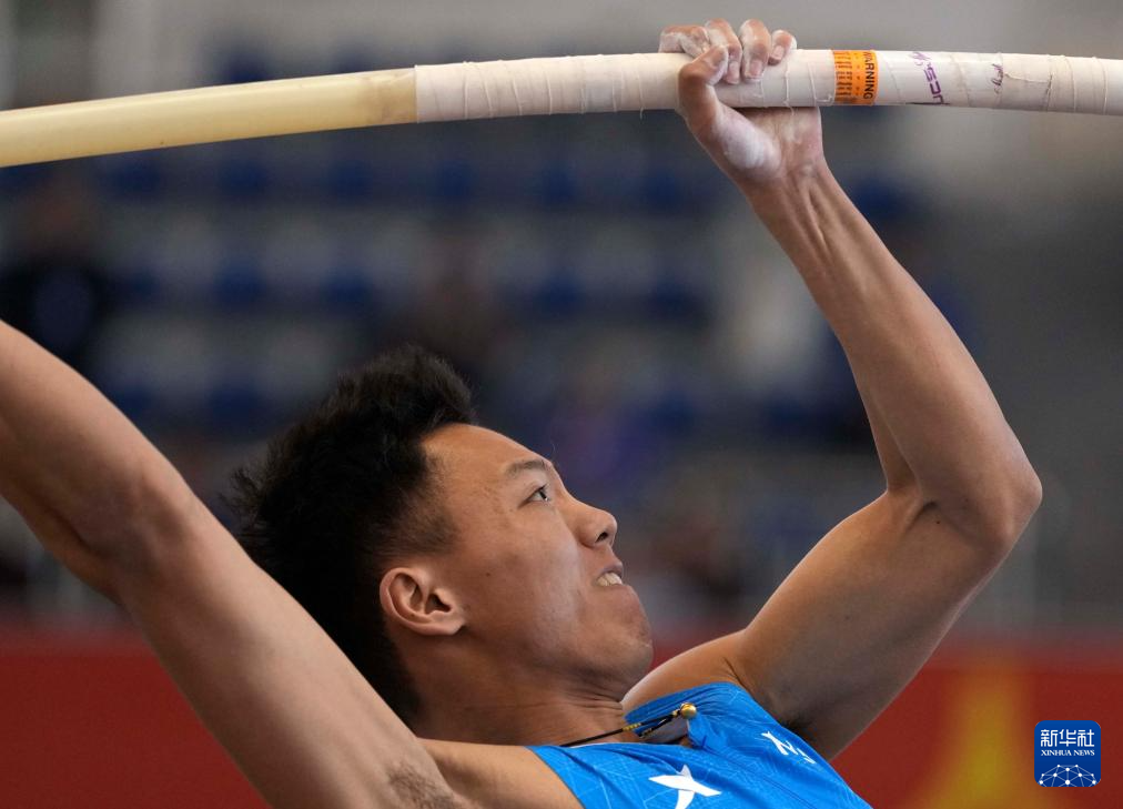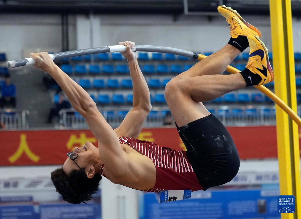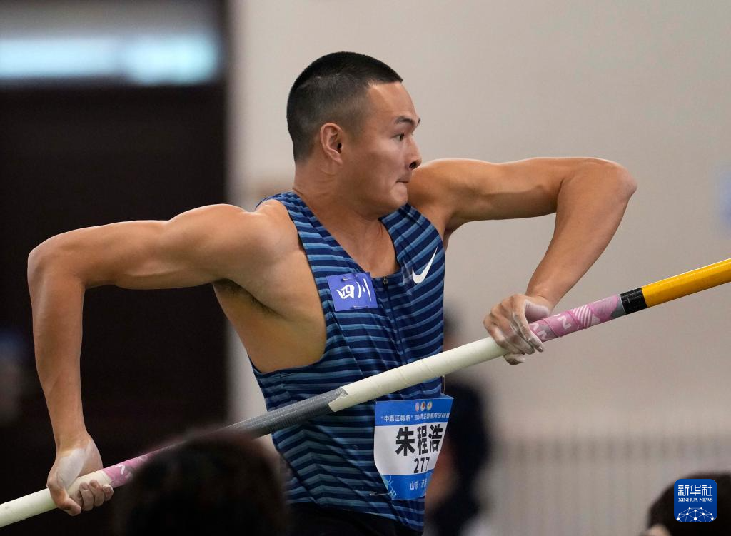 3月28日,四川队选手朱程浩在男子七项全能撑杆跳高比赛中。