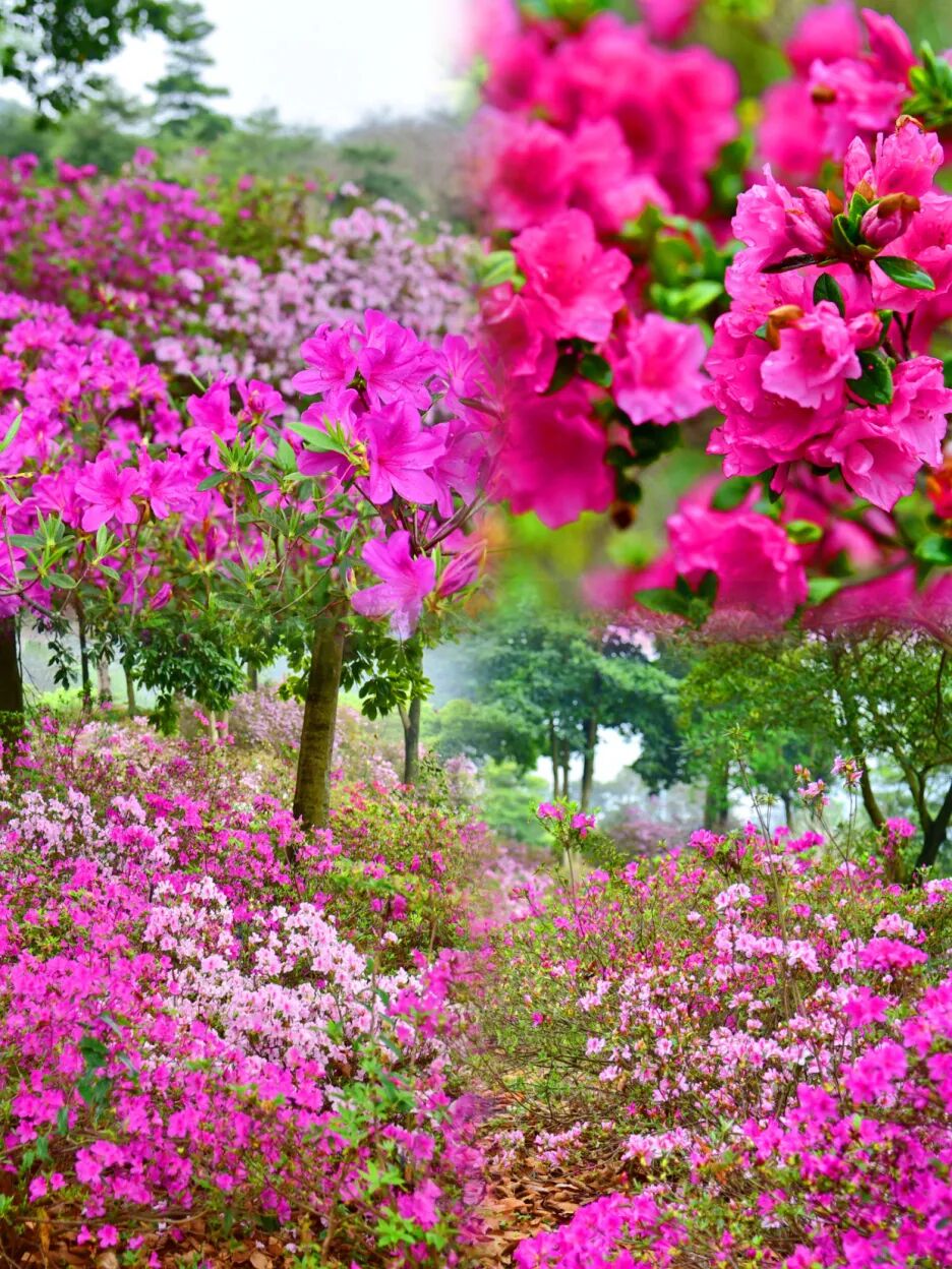 卡玛生态园的花海里 杜鹃花开得正盛 一丛丛紫色点缀在林间 不像红色那般张扬 却自有一份沉静的美 适合停下来,拍一张近景特写