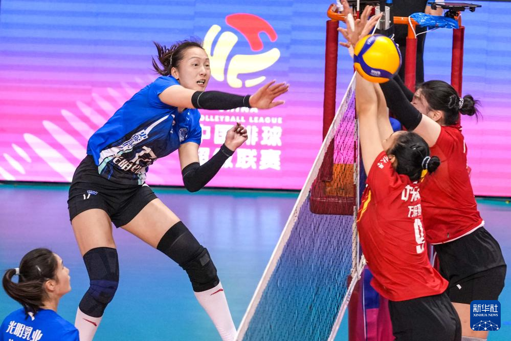 3月28日,上海光明优倍队球员仲慧(上左)在比赛中扣球。