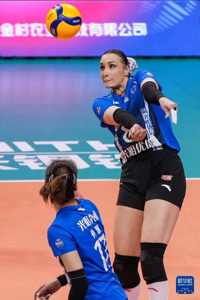 3月28日,上海光明优倍队球员沃隆科娃(右)在比赛中传球。