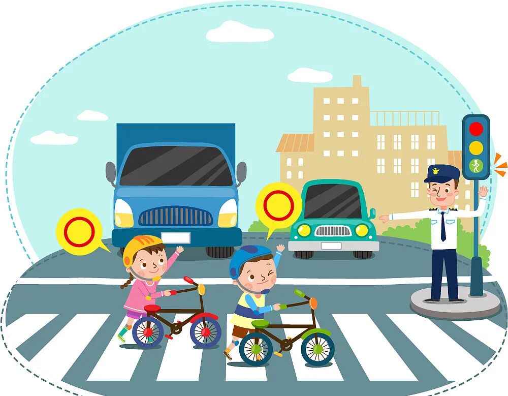 交通规则记心间:过马路走斑马线,不闯红灯,不翻越护栏。未满12周岁不骑自行车上路,未满16周岁不骑电动自行车。不在马路上追逐打闹,行走时不看手机、不听音乐。