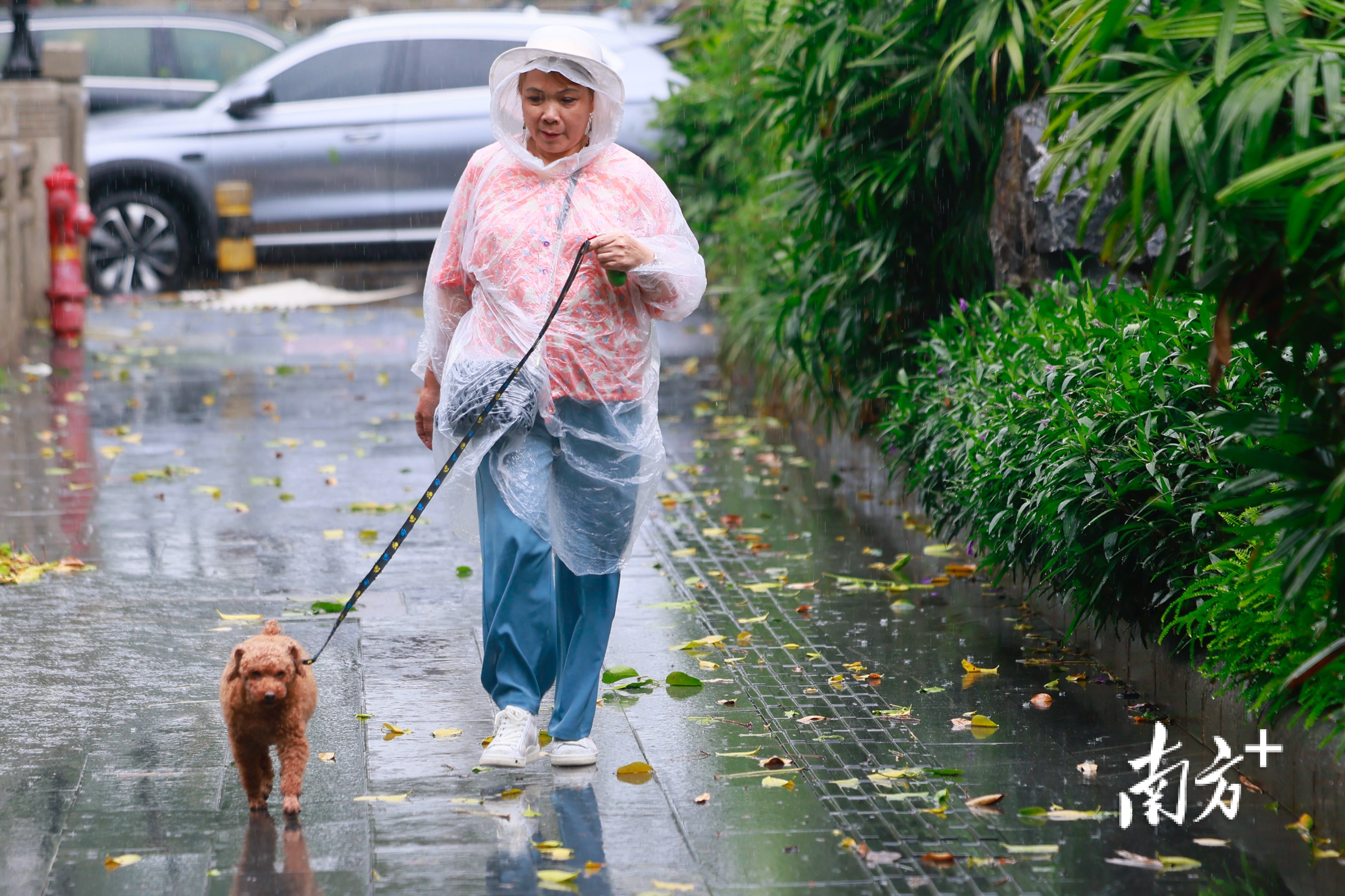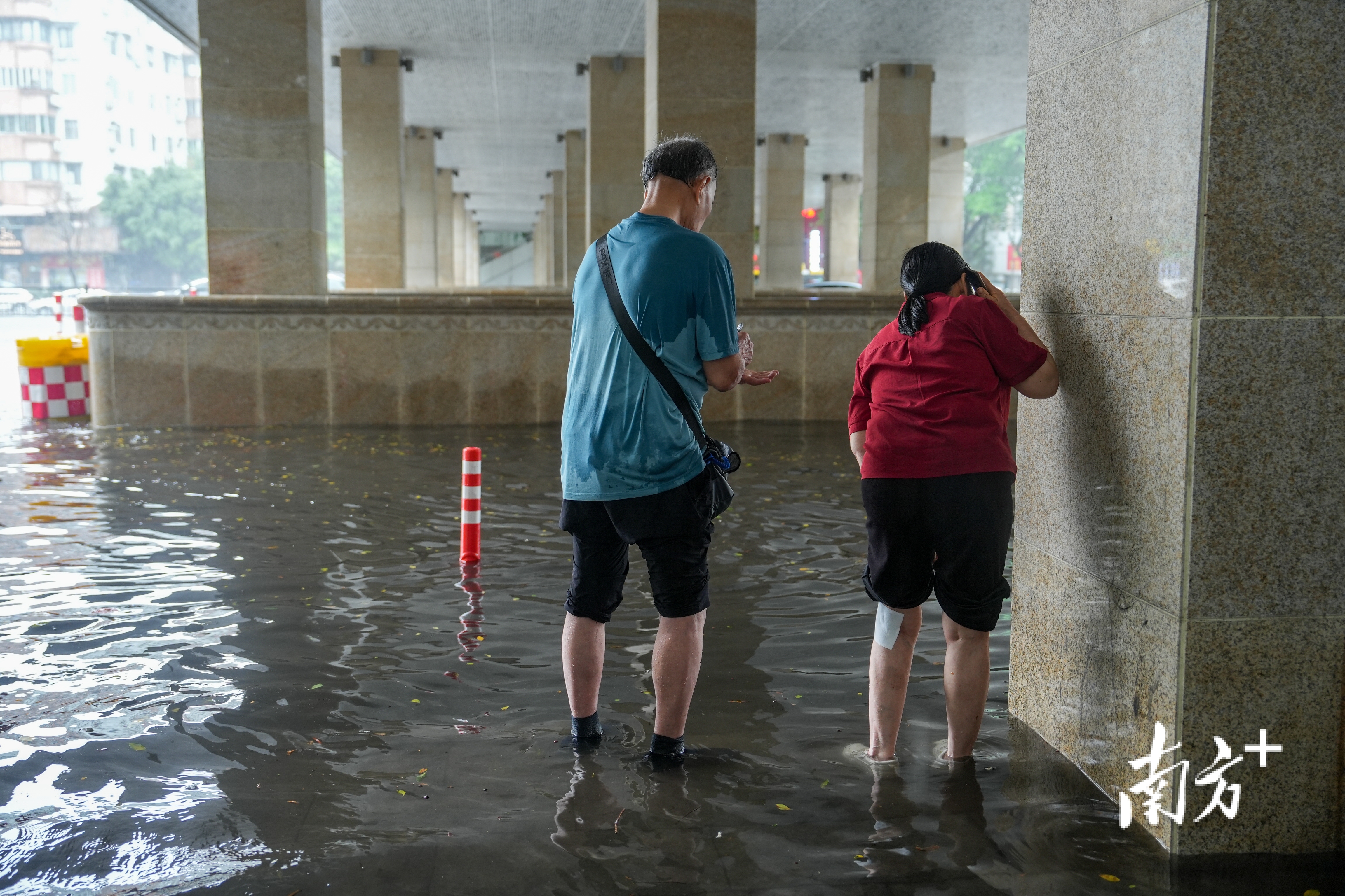 两名过路的热心市民冒着大雨,在没过脚踝的积水中清理落叶、拖移树枝,协助恢复道路通畅。