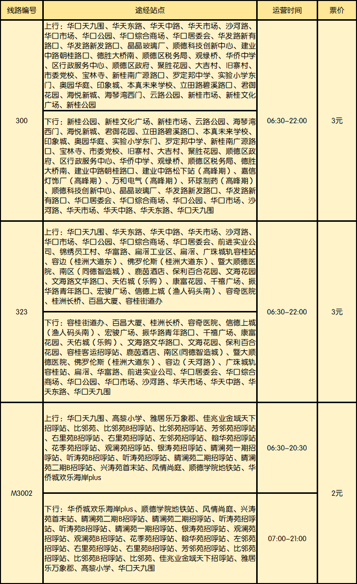 2026年4月5、6、11、12日,途经安乐阆苑周边“华口天九围”站的公交300路线(华口天九围-新桂公园)、323路线(华口天九围-容桂街道办)、M3002(华口天九围-华侨城欢乐海岸plus)按时发班,并提前做好公交运力的排班调度。