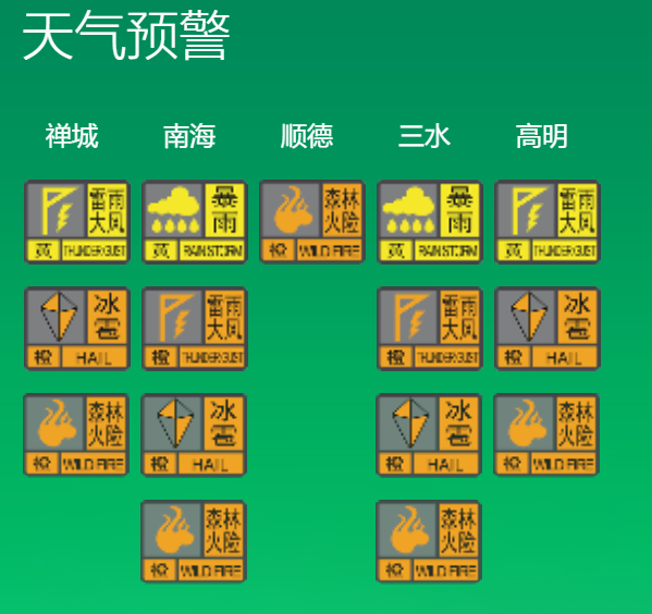 目前三水区冰雹橙色、暴雨黄色