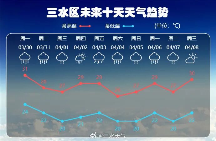预计3月30日多云到阴天,有中雷雨、局部暴雨;31日阴天,有中到大雨、局部暴雨;4月1日至2日阴天到多云,有分散阵雨;3日多云到阴天,有雷阵雨、局部大雨;4日阴天,有中到大雨、局部暴雨;5日阴天到多云,有阵雨;6日多云到阴天,有中到大雨、局部暴雨;7日至8日阵雨转多云。雷雨天气趋频繁,需做好强对流天气防御措施。三水区气象台2026年3月29日15时30分发布。