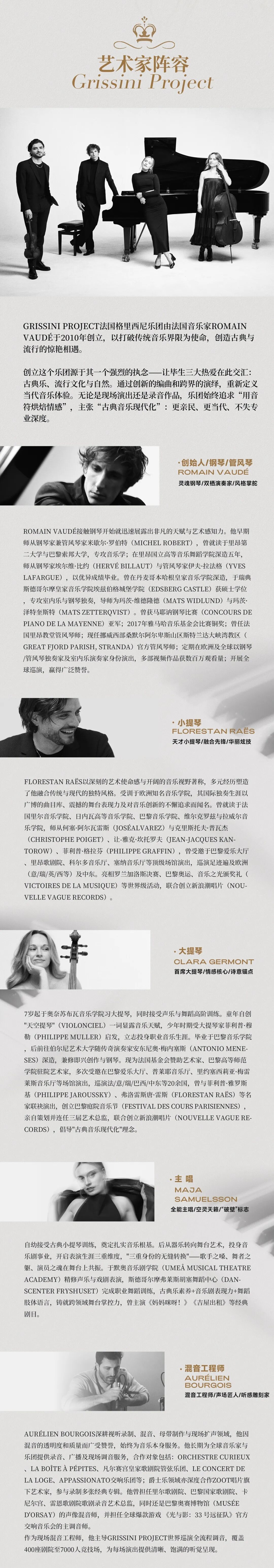 作为来自法国的室内乐组合,Grissini Project长期活跃于欧洲主要音乐厅舞台,并多次展开跨国巡演,演出在多个城市备受欢迎、屡创热销佳绩,积累了稳定而广泛的国际观众基础。