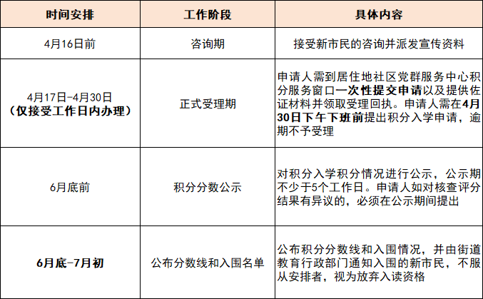(六)温馨提示:预计今年积分学位较少,建议新市民做好回户籍地就读或到民办学校报名的准备。