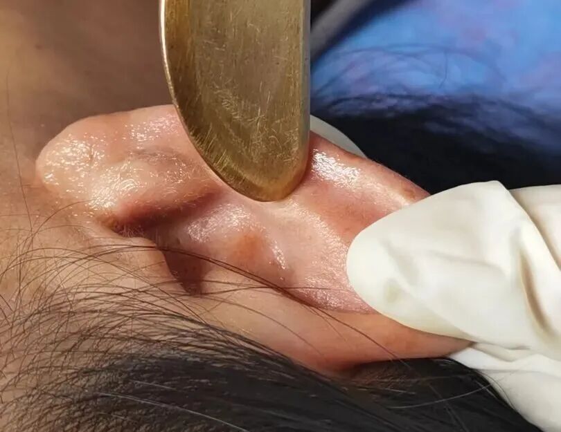 耳部刮痧是建立在耳部全息理论和铜砭刮痧基础上的全新中医特色疗法,通过使用铜砭刮痧板在耳朵的经络及穴位上刮拭,结合铜砭刮痧和耳穴埋豆疗法,达到疏通气血、调和阴阳、扶正祛邪、治病防病的作用。所谓“小部位、大功效”。相较于传统耳穴压豆,耳部刮痧作用面积更大、刺激更全面,且操作便捷、无创无痛,尤其适用于失眠、焦虑、头痛、内分泌失调等功能性疾病。