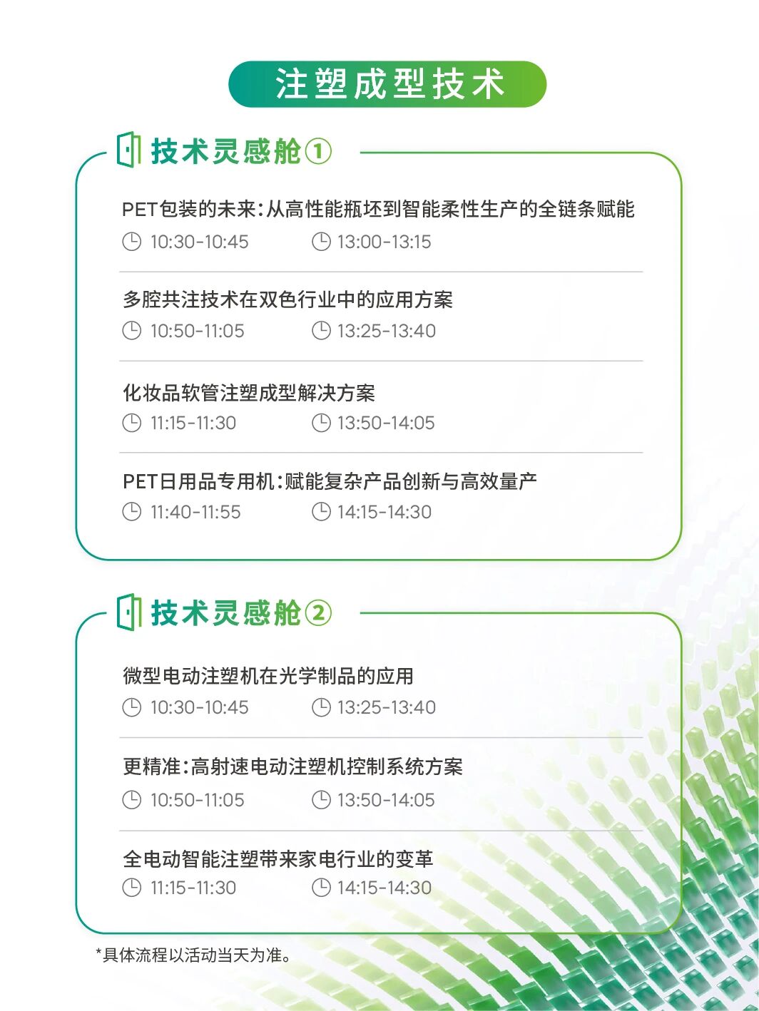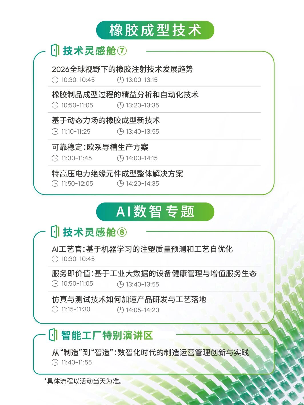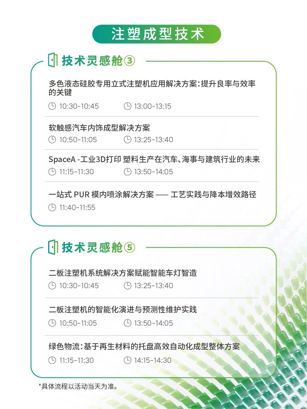 涵盖:注塑成型技术、半固态&压铸成型技术、橡胶成型技术、AI数智专题等四大领域、30+前沿议题。