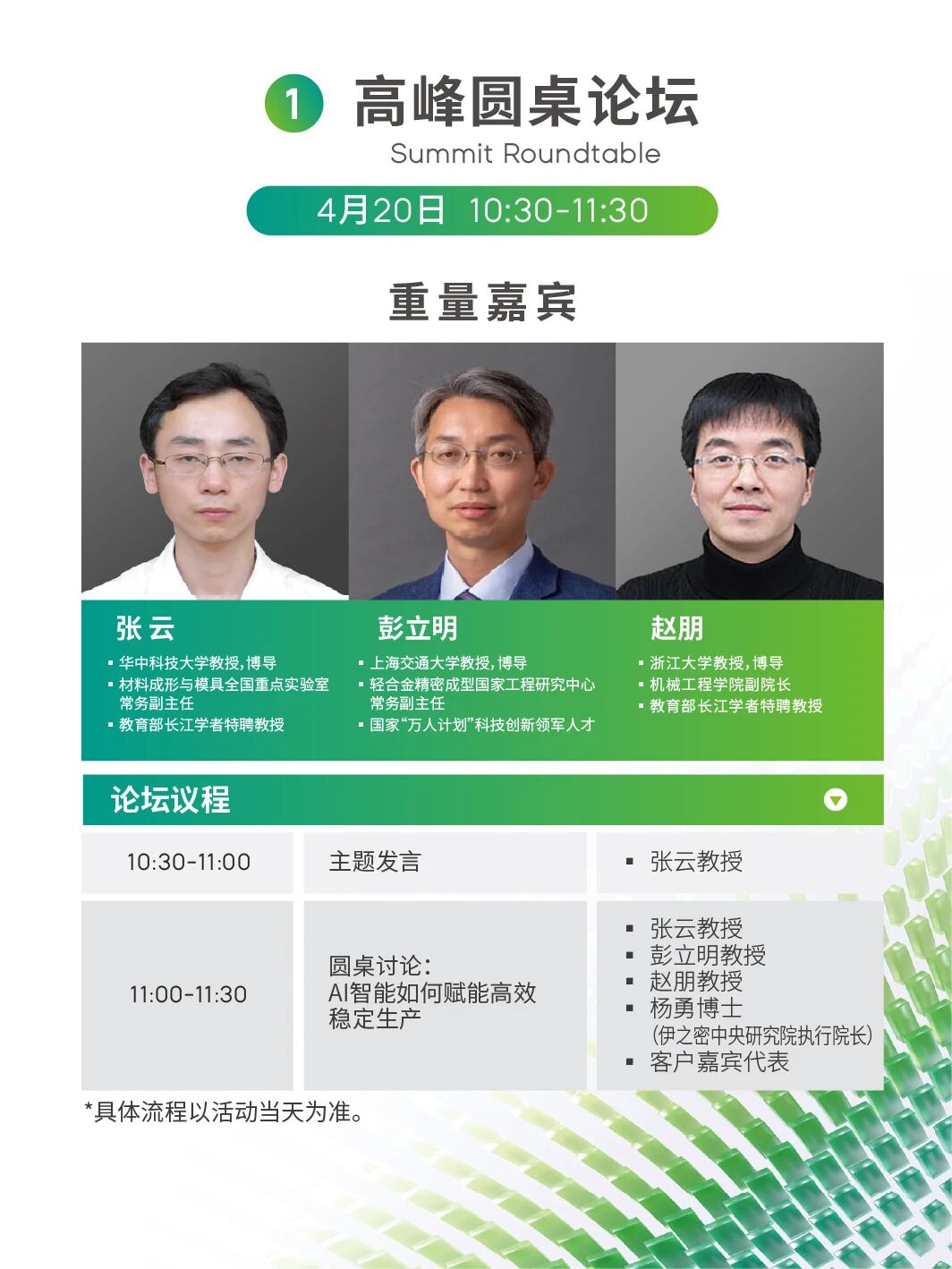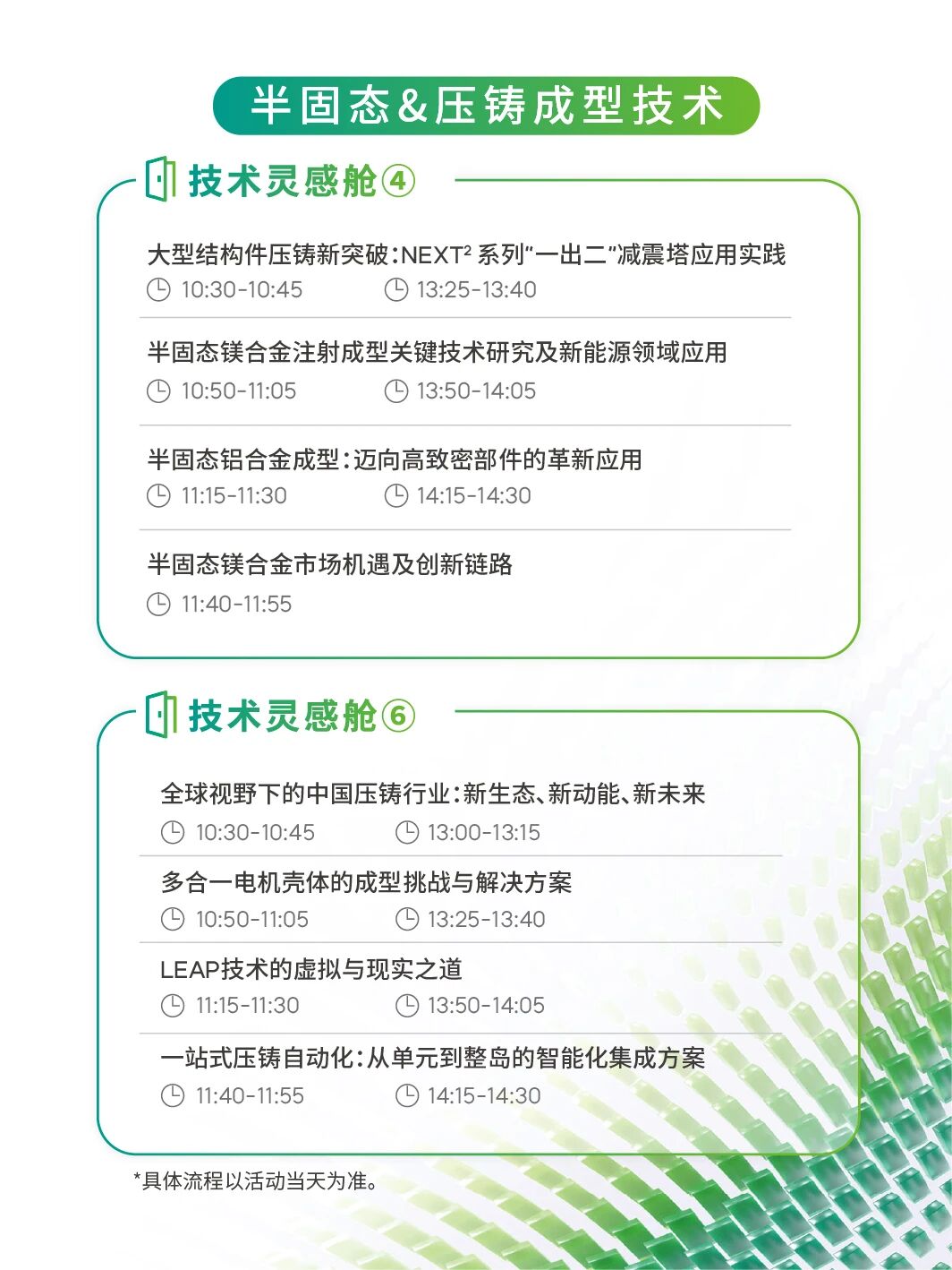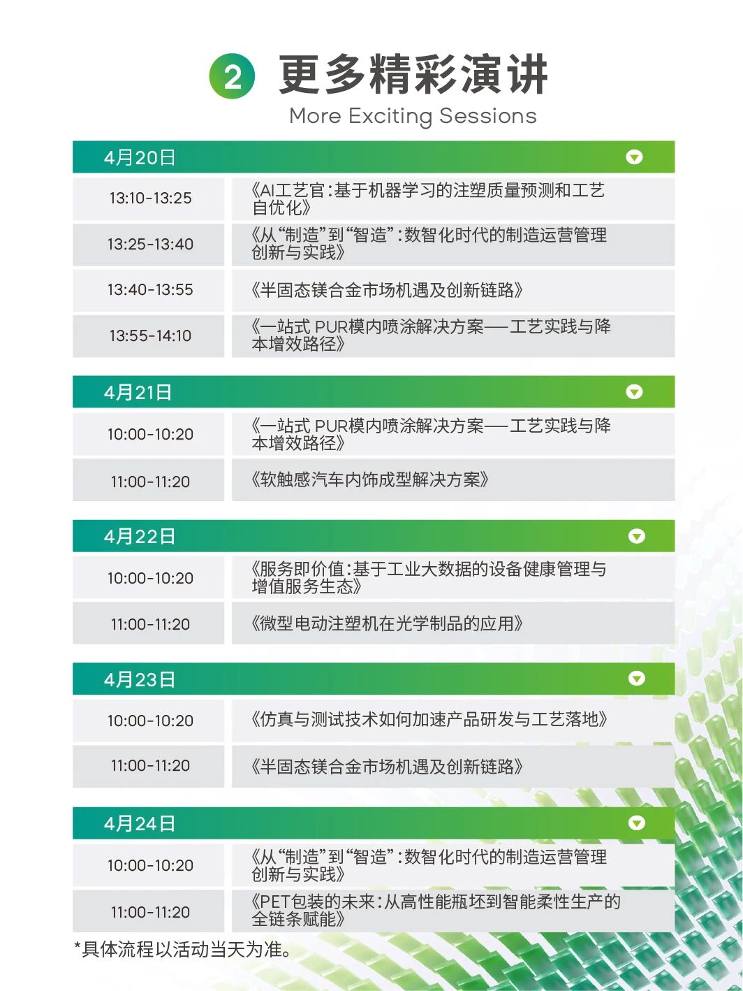 涵盖:注塑成型技术、半固态&压铸成型技术、橡胶成型技术、AI数智专题等四大领域、30+前沿议题。