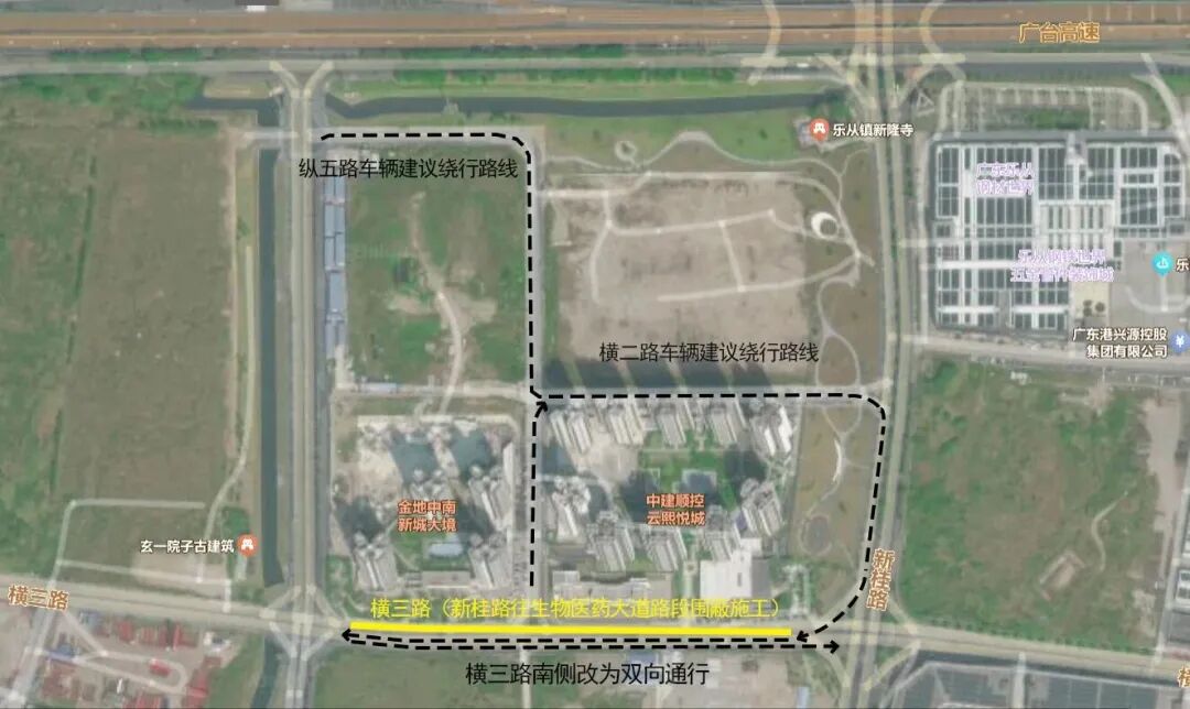 施工期间将对横三路(新桂路至生物医药大道路段)北半幅进行封路围蔽施工,期间南半幅道路将实施双向通行,其余周边道路可正常通行。请途经该路段的市民按交通疏导员及现场指示牌绕道通行。