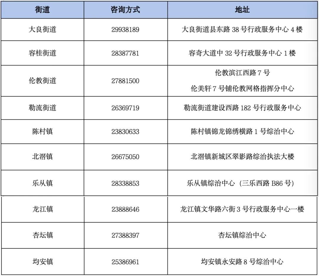 | 镇街 | 咨询电话 |