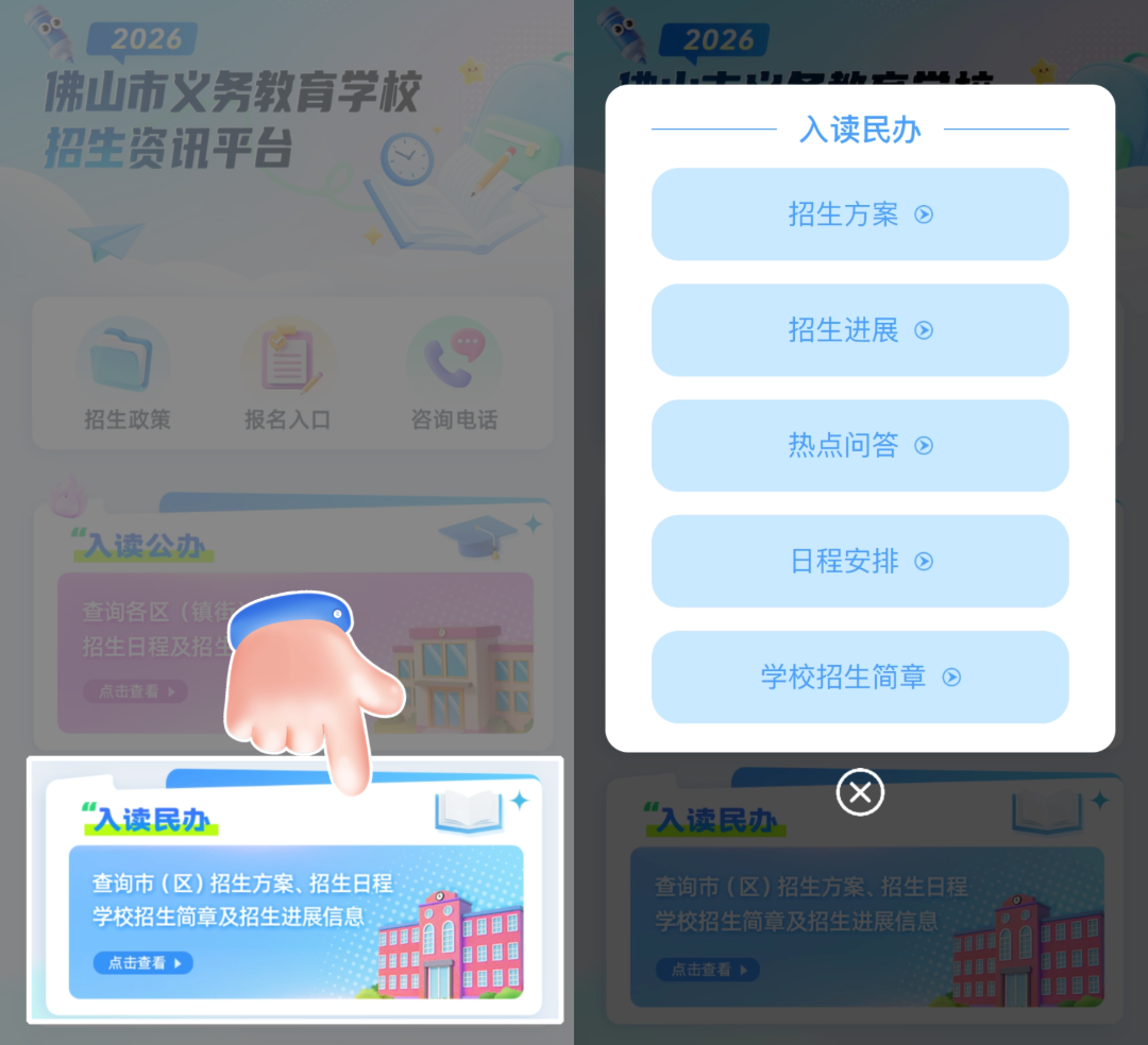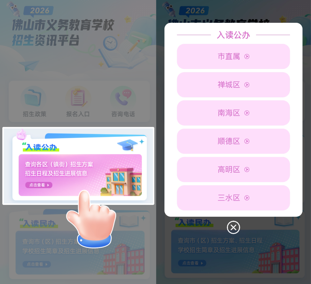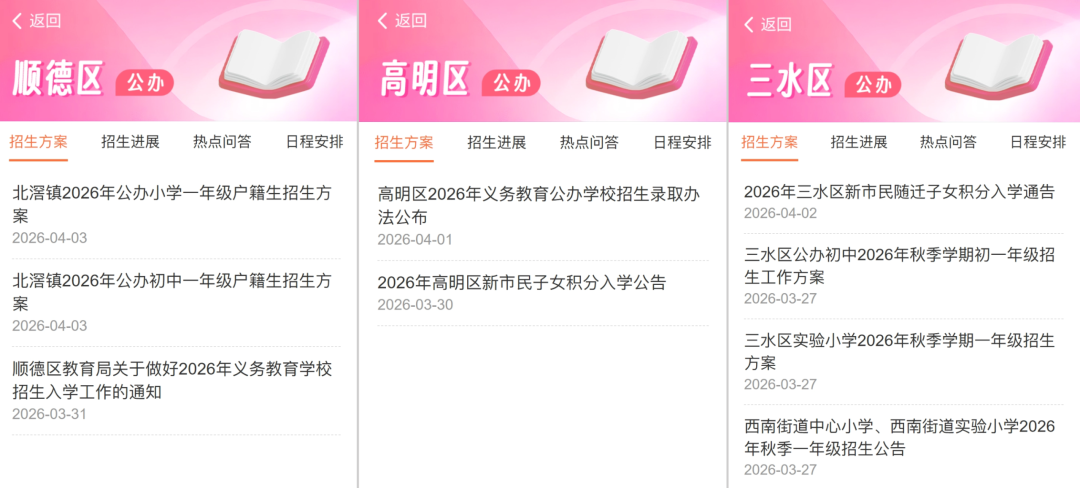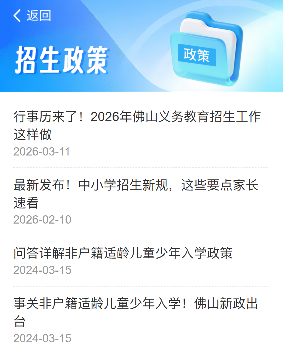 2026年佛山市义务教育学校招生资讯平台滚动更新全市五区招生政策、招生方案、热点问答、日程安排、报名入口、学校招生简章等内容,帮助广大家长在升学季掌握权威、完整一手资讯信息。说明:部分内容将根据义务教育招生工作安排持续更新,敬请留意最新动态。
