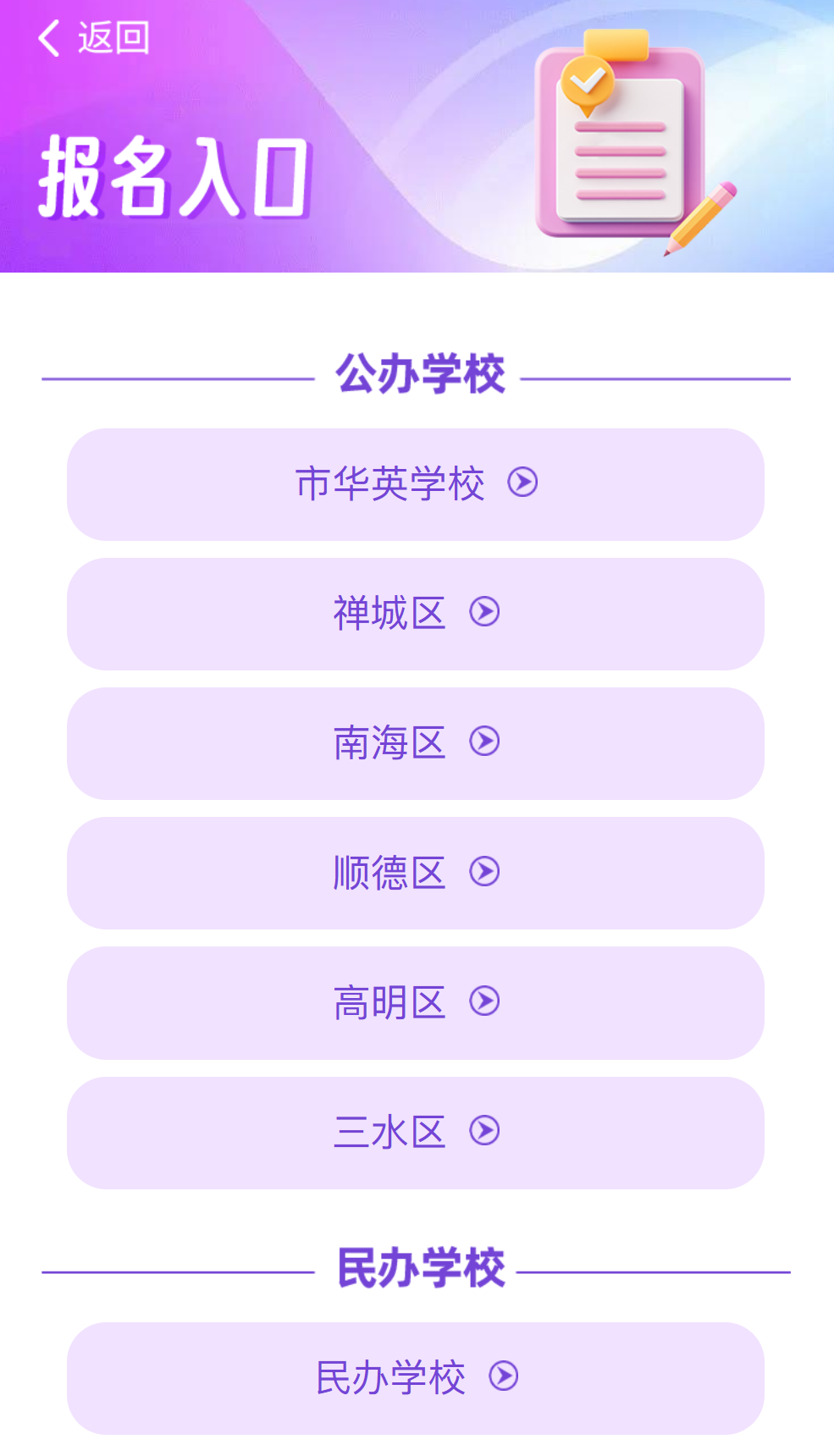 这里将发布佛山市民办义务教育学校招生方案,提供报名、志愿填报、摇号录取、补录等多个环节的指引信息,后续还可以查看各民办学校招生简章,了解学校的招生计划、办学特色、办学条件、收费标准等信息。