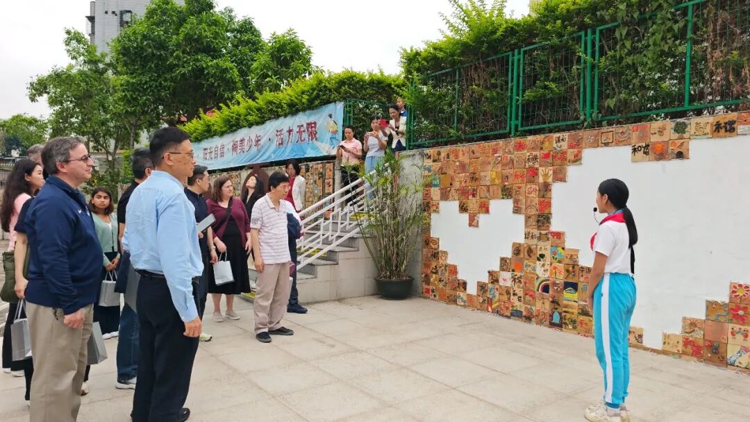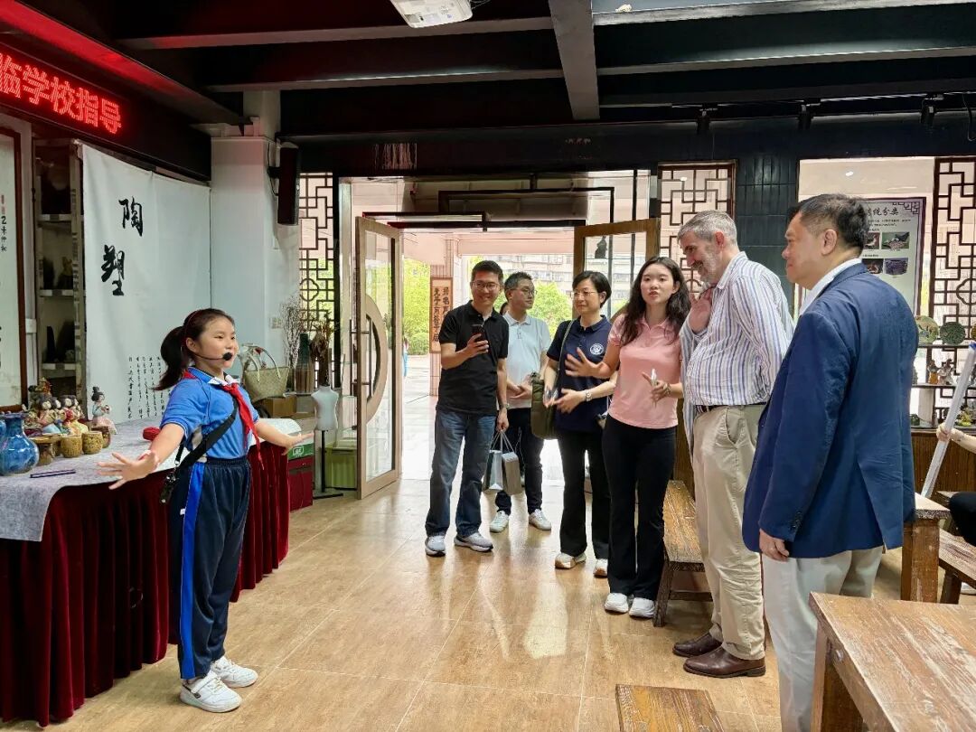 石湾第一小学是禅城区陶艺教育特色学校代表之一,学校坚持把对“石湾陶艺”的传承工作与学校课改工作、教书育人工作紧密结合,五育融合,陶美课程成为引领学校发展的核心动力。学生讲解员带领考察团漫步校园陶艺文化区,先后参观了陶艺三园壁、戏曲陶艺展示区、醒狮陶艺展示区、毕业梦想砖展示区、茶文化陶艺作品展示区及陶稚园。孩子们生动的讲解与充满童趣的陶艺作品,令考察团频频驻足。