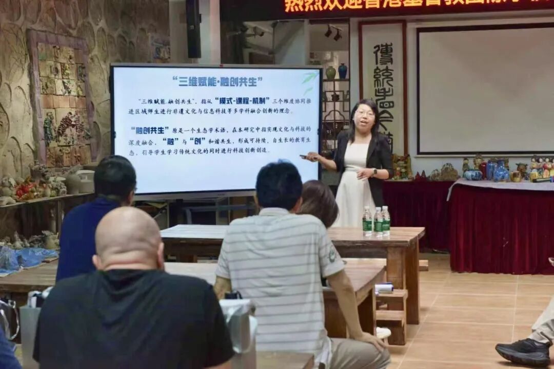 随后,受考察团邀请,广东省黄美仪名师工作室进行了《三维赋能・融创共生:区域非遗创客教育生态体系建构与实践》分享。工作室助手赵慧苹老师从理念创新到实践路径,系统介绍了禅城区非遗与创客教育深度融合的生态体系,生动呈现了团队构建的八大类非遗创客课程,并重点分享了《AI龙狮校本课程构建与实施》等典型案例。禅城区丰富多元的非遗创客课程内容与创新实践成果,充分展现了传统文化在科技赋能下的当代转化,激发了与会人员的浓厚兴趣与热烈讨论。
