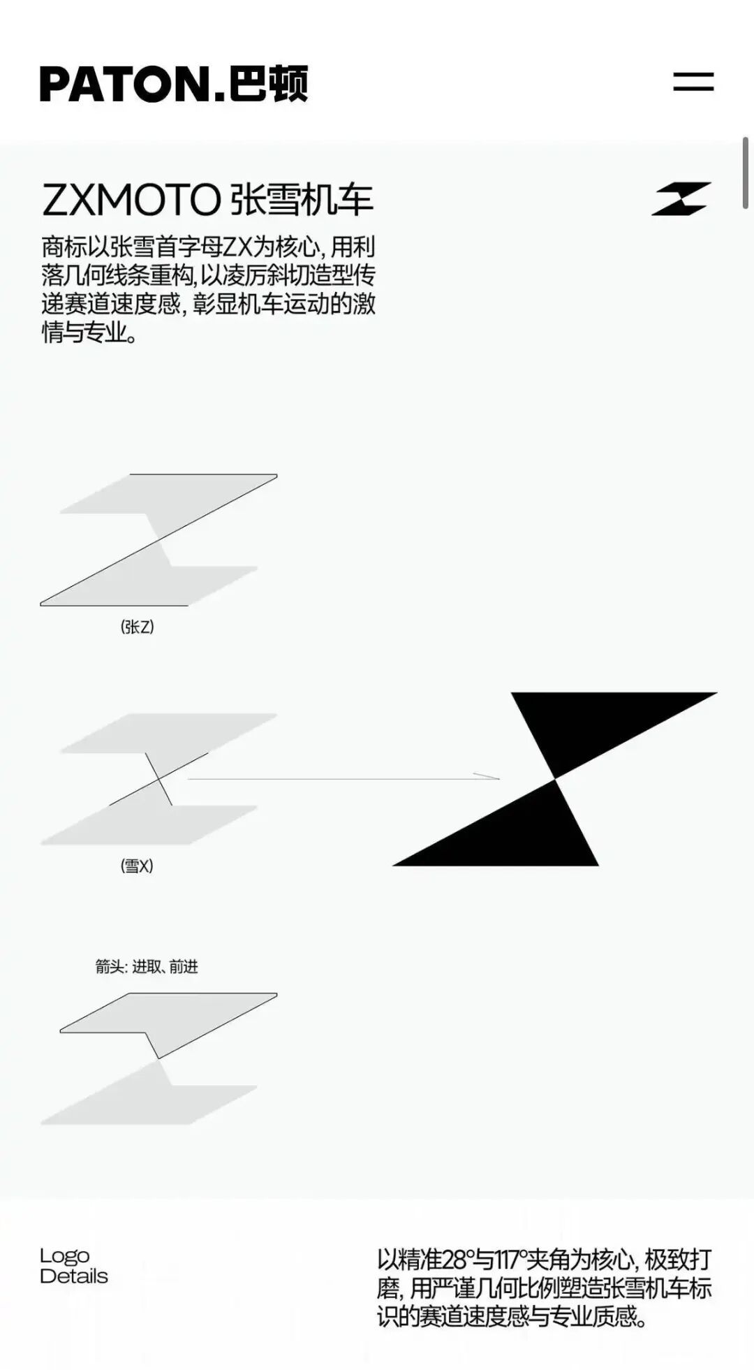 据了解,张雪机车的LOGO由杭州巴顿品牌设计公司负责。该公司官网展示了张雪机车ZXMOTO品牌全案设计案例,包括LOGO、店面、服装、员工工牌等,设计理念是商标以张雪首字母ZX为核心,用利落几何线条重构,以凌厉斜切造型传递赛道速度感,彰显机车运动的激情与专业。该公司的客户还包括香飘飘、古茗、CoCo都可、街电等。
