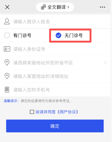 3.按照提示绑定个人信息,若没有门诊号,请选择“无门诊号”进行绑定;