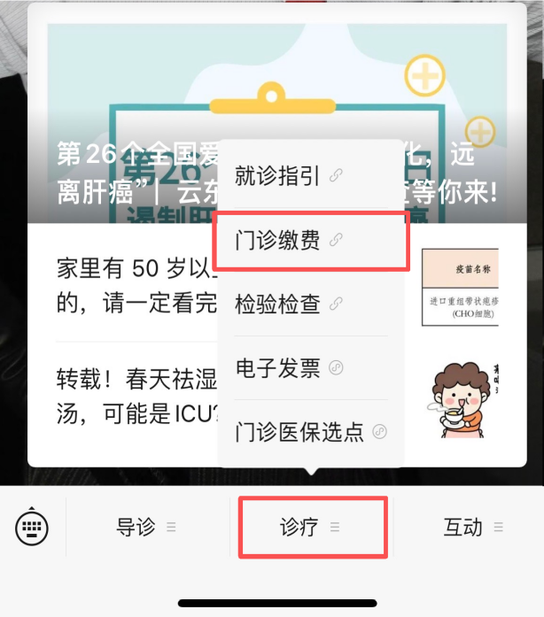 2.进入公众号后,点击底部菜单栏“诊疗”,选择“门诊缴费”选项;