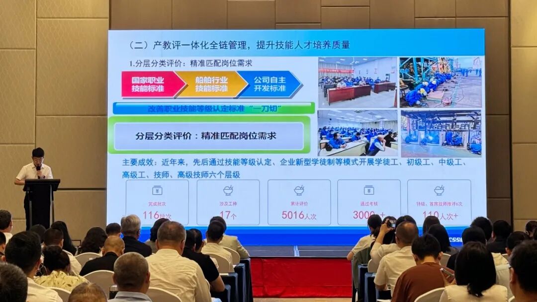 广船国际作为国有大型制造企业,在产教评自主评价政策支持下,将评价范围拓展至链员企业和劳务工群体,与核心链员企业共同建立起与薪酬待遇、岗位使用相挂钩的“新八级工”制度体系。公司已评审首席技师2人、特级技师14人,为5家链员企业评价认定3000多名技能人才,按月发放300—2000元技能津贴,其中160余名高技能人才到管理岗位任职,实现职业发展跨越。
