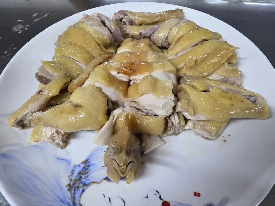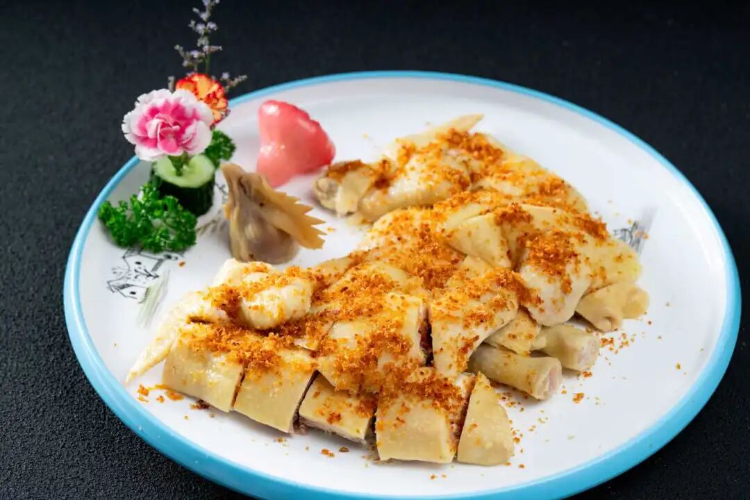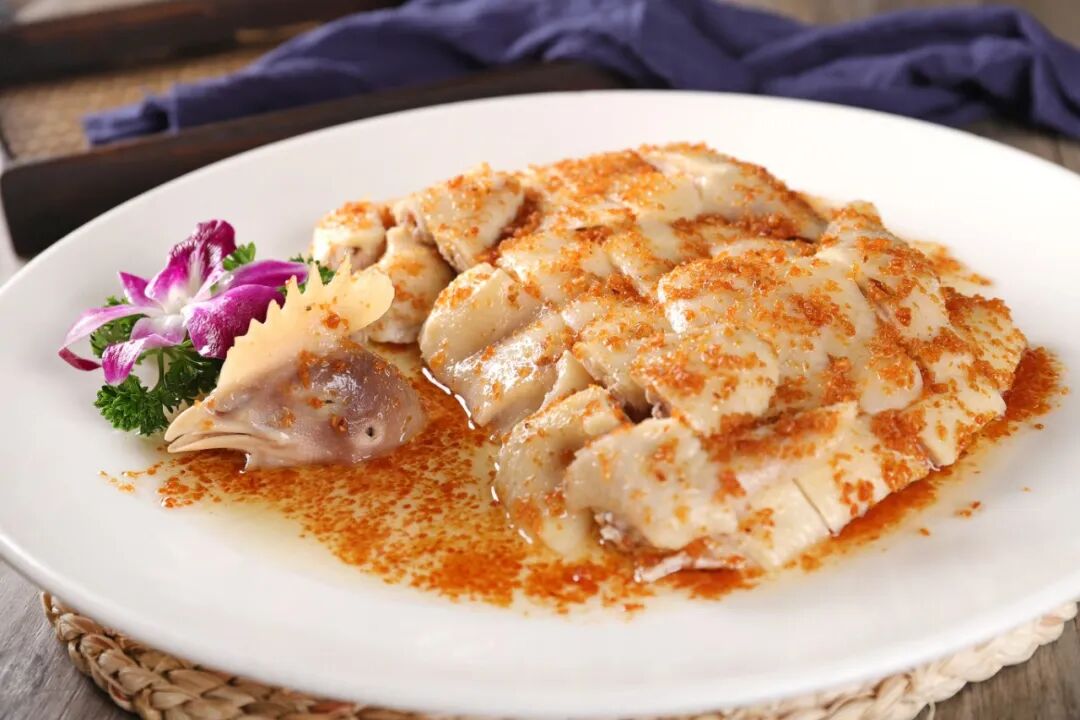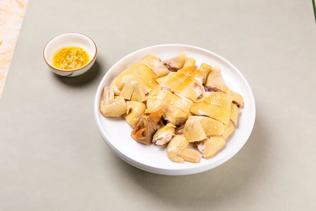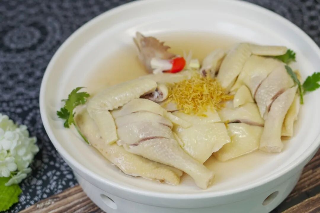 白切鸡:选用自养足日清远走地鸡,山林散养、谷物喂养,肉质紧实鸡味浓郁;采用传统白切工艺浸煮,经冰水激皮,鸡皮金黄爽脆、肉质嫩滑多汁,骨带微红而不生,原汁原味、清淡鲜香,搭配秘制姜葱蘸料,尽显粤式经典风味,皮脆肉嫩、鲜香味醇,是宴席家宴与日常用餐的上乘之选。