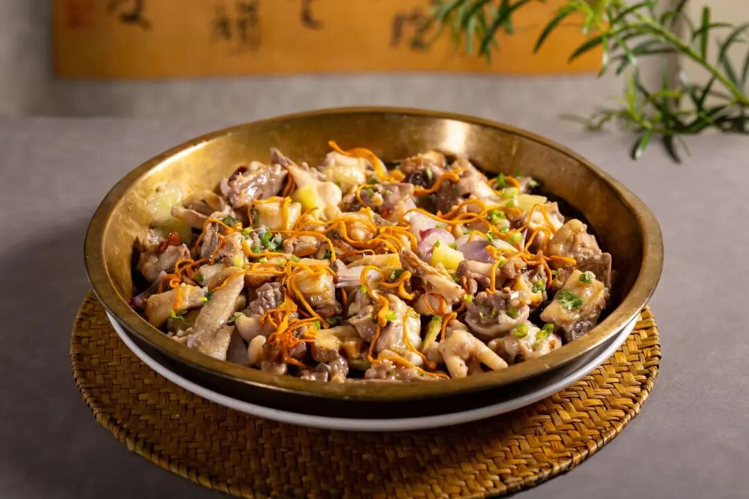 荔枝菌蒸杏花鸡:精选肉质紧实、鸡味浓郁的清远杏花鸡搭配时令鲜荔枝菌,以清蒸保留本味。鸡肉皮薄肉嫩、鸡味醇厚,荔枝菌脆嫩鲜甜、菌香浓郁。简单油盐调味,鲜上加鲜,汤汁清亮回甘。江景佐食,一口尝尽岭南时令鲜醇,清爽不腻。