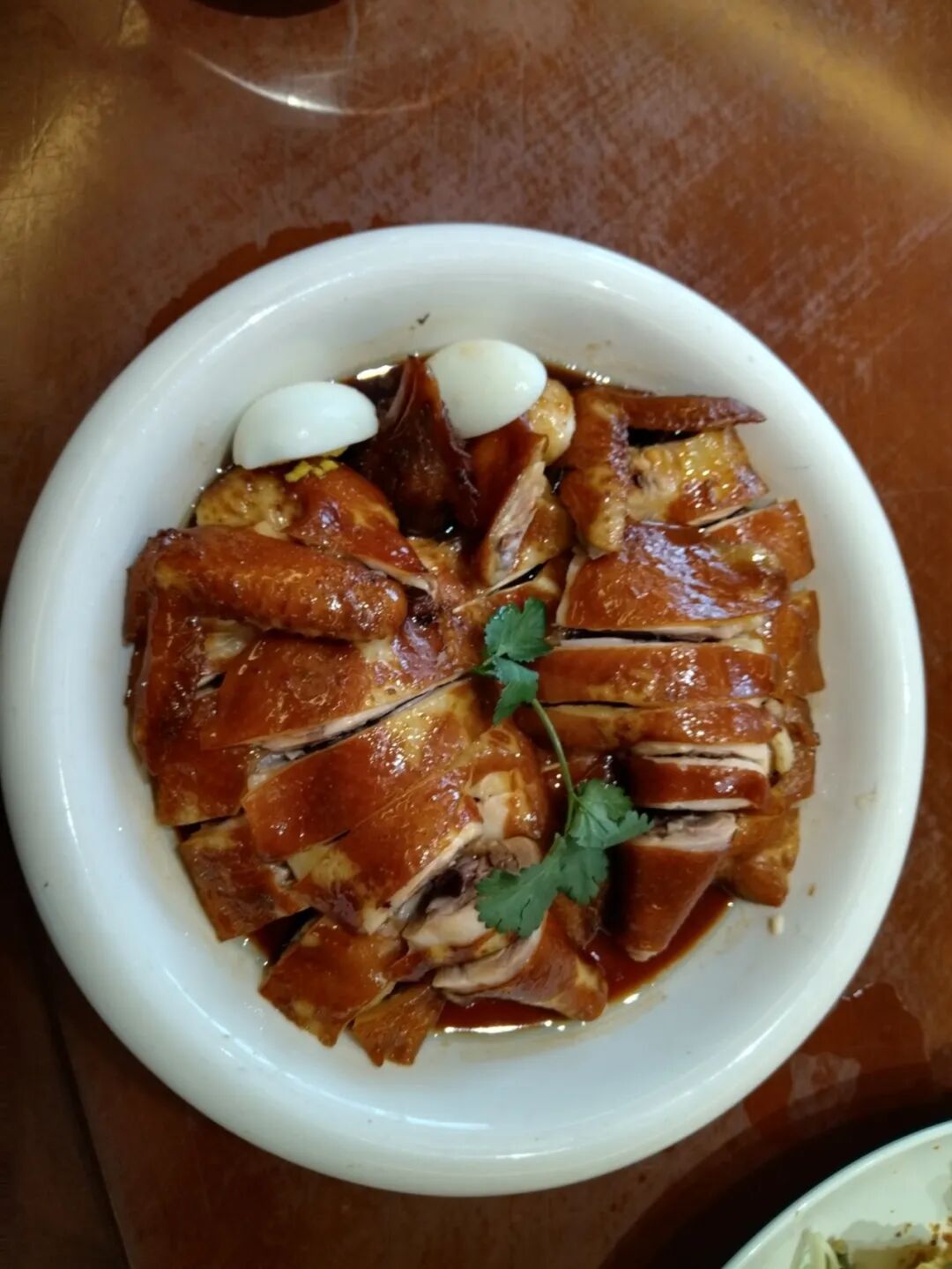 鲜贝盐水鸡:品种为贵妃鸡。顺德人有几句话正所谓鸡有鸡味鱼有鱼味。经过加入蒸过鲜贝的汁水,使鸡本身的鲜味鲜上加鲜。加上灵魂酱汁姜葱油。晶莹的「皮冻层」高品质的白切鸡在皮与肉之间会有一层透明、像果冻一样的油脂凝胶(皮冻),这是鸡皮胶原蛋白与鸡油在冰镇后形成的精华,入口即化。