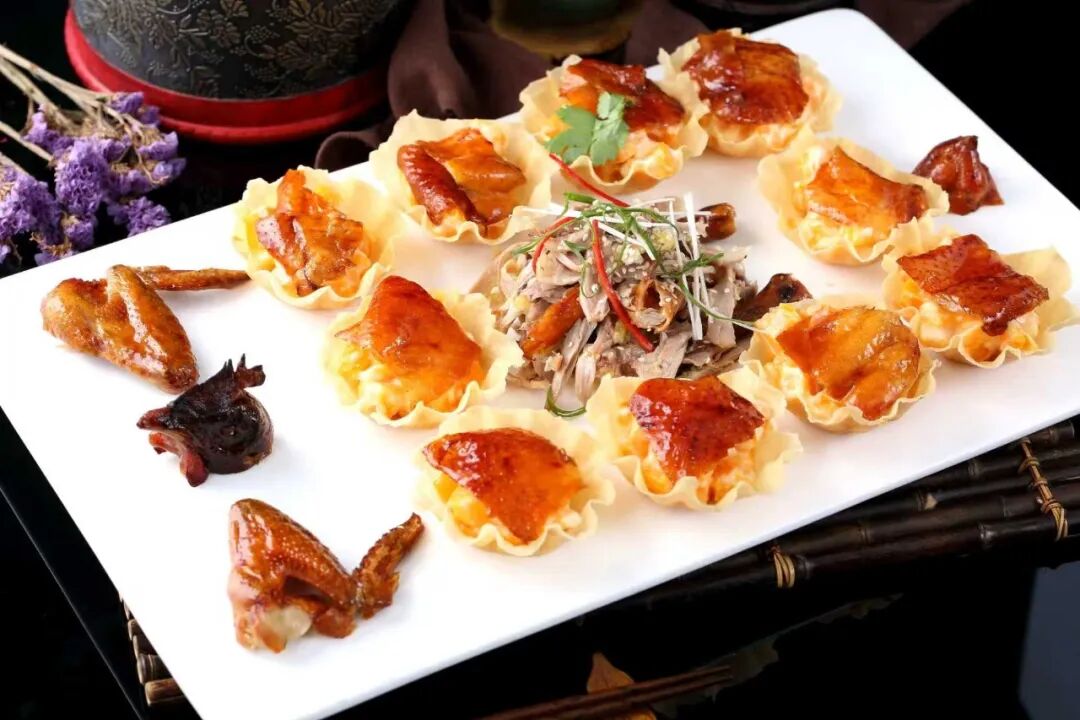 七彩捞鸡:色香味俱全的视觉盛宴。精选鲜嫩文昌鸡,白切后斩件,铺上红椒、黄椒、洋葱、香菜、葱丝、姜丝、花生碎七色配料,淋入秘制捞汁。上桌后由食客亲手捞匀,寓意“捞起风生水起”。鸡肉皮爽肉滑,酱汁酸辣开胃,每一口都层次丰富。在龙冠楼,这不仅是道凉菜,更是一份吉祥好意头,最适合宴客开场。