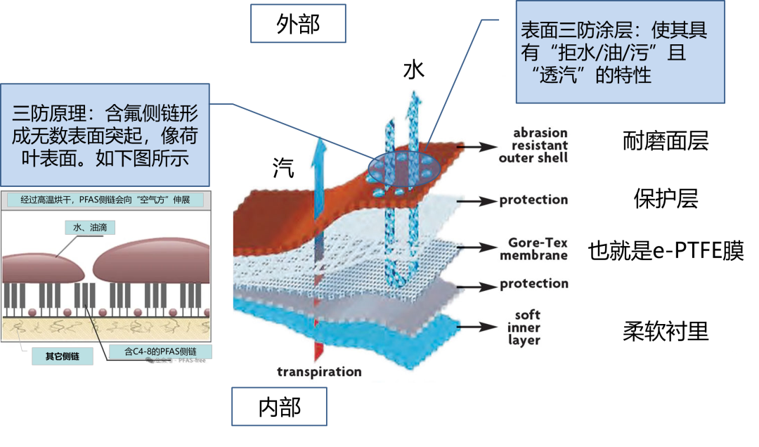 含氟冲锋衣有两个部分可能用到PFAS:表面防水、防油、防污的“三防”涂层,以及中间防水透湿的高分子膜。