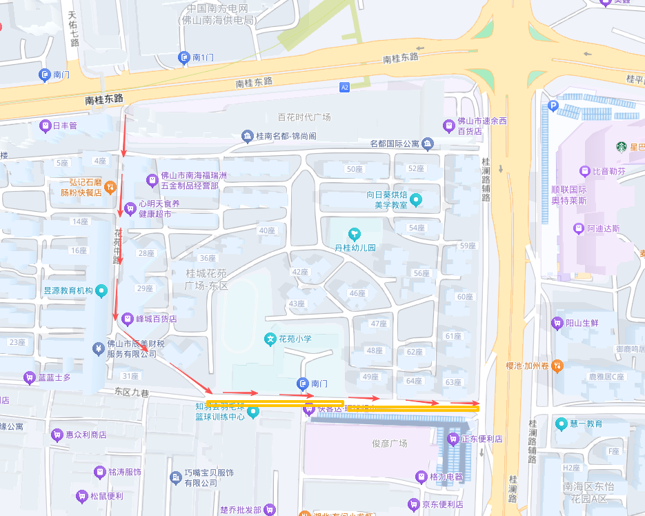 黄框区域为交通管制区域,红色箭头为建议绕行路线/南海桂城