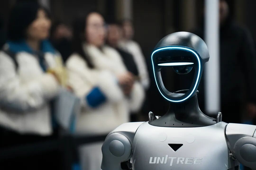 3月11日,浙江杭州,2026中国具身智能机器人产业大会开幕,宇树科技人形机器人G1与参观者互动 图源:视觉中国