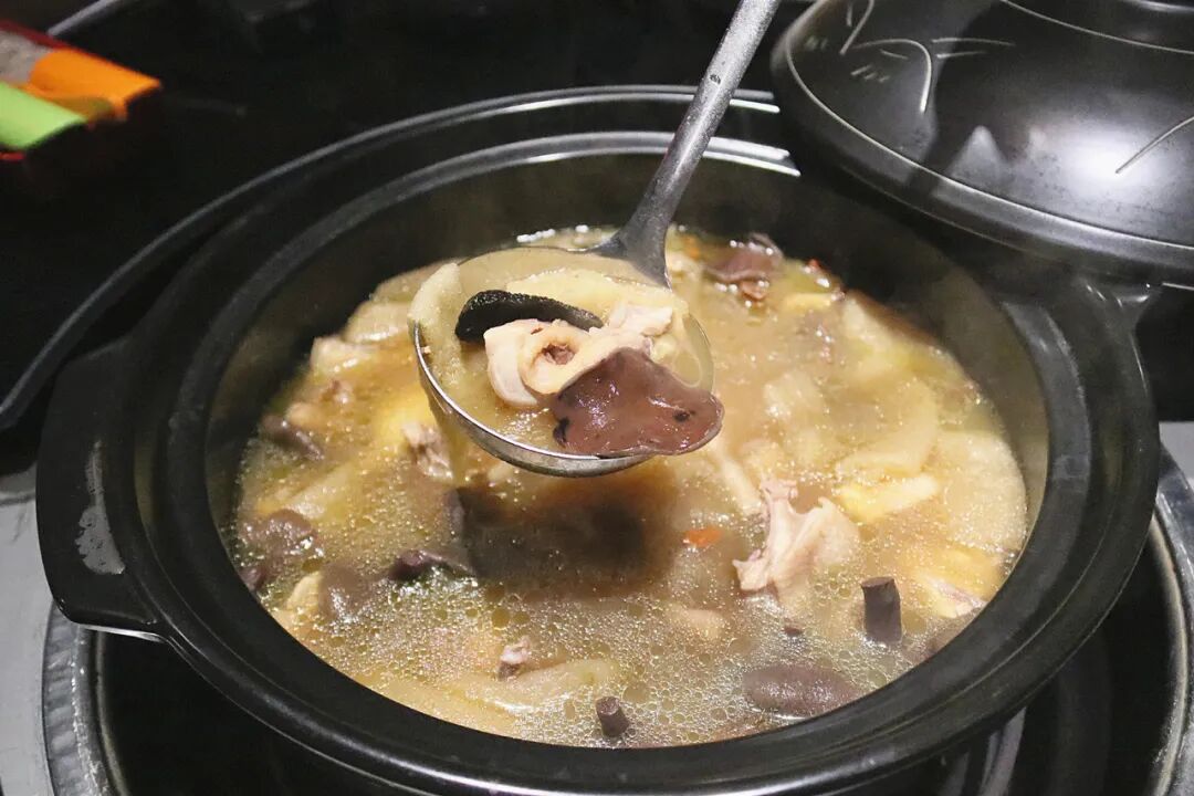 巴掌大的灵芝作为汤底,配上元肉、枸杞等多种靓汤料,用明火熬足数小时,香气闻来就觉得沁人、矜贵。