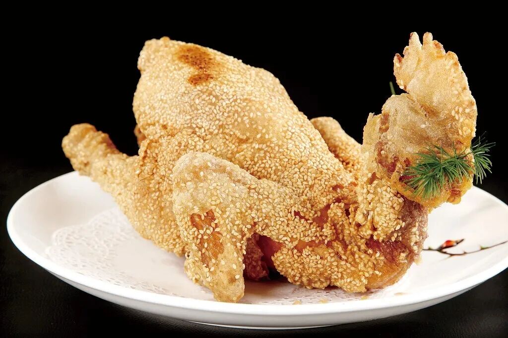 这道菜的关键在于芝麻与鸡肉的融合:优选整鸡腌制后,均匀裹上白芝麻,入锅炸至金黄。外皮是香脆的芝麻壳,内里鸡肉依然嫩滑多汁,咸香入味,口感丰富。