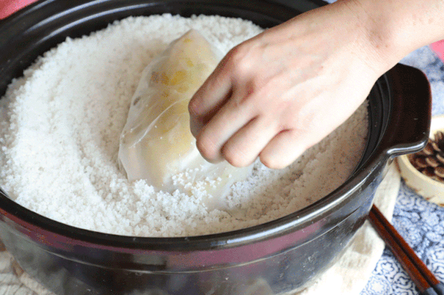制作时,将鸡原只包好放入瓦煲内,再用炒烫的生晒粗盐焗制,待盐味自然渗透进鸡肉里,经过5道工序超10小时的精心制作,鸡味浓郁咸香,回味无穷,盐焗的香气一路透进鸡骨头里。