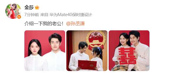 4月9日,金莎宣布领证结婚:介绍一下我的老公!@孙丞潇
