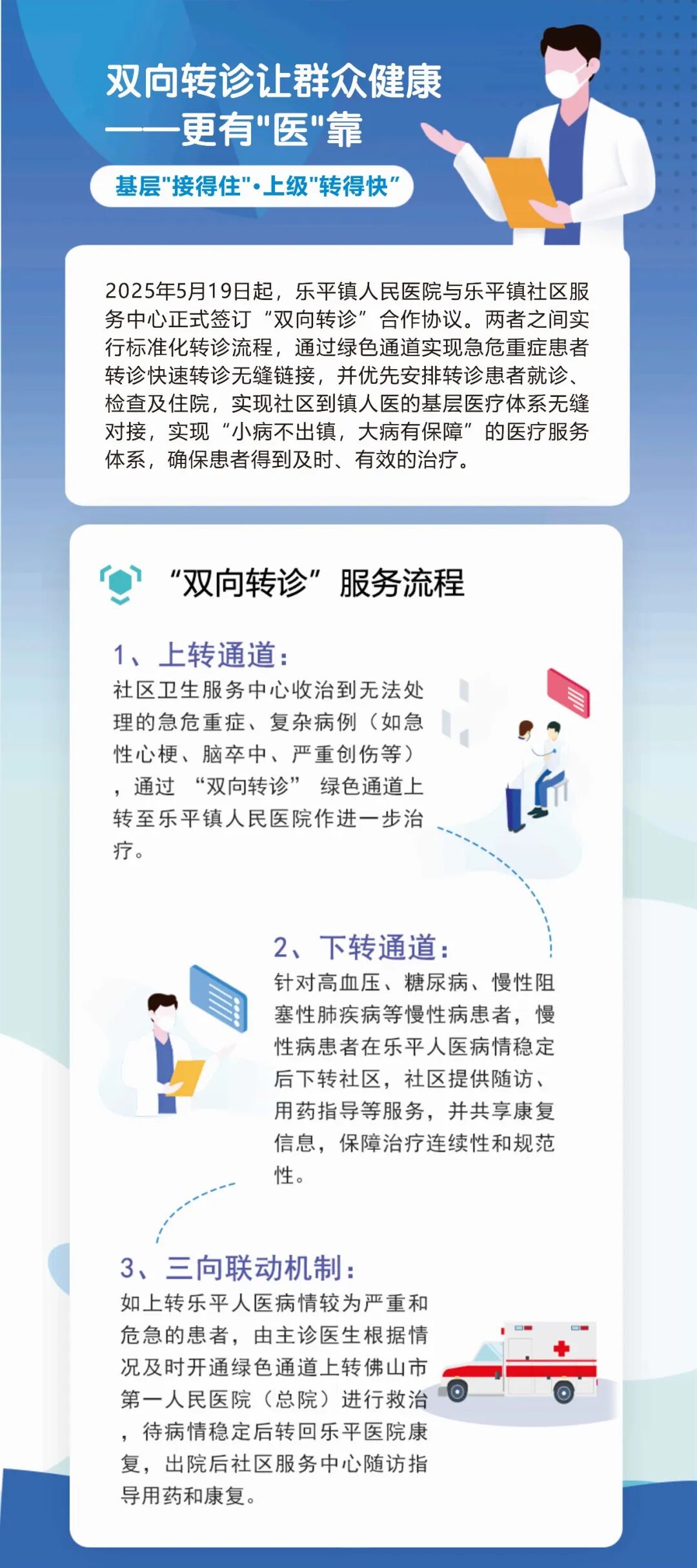 近日,佛山市第一人民医院附属乐平医院(下称“附属乐平医院”)与佛山市第一人民医院(下称“市一医院”)依托紧密型医联体双向转诊绿色通道高效联动,完成了一场与死神竞速的生命救援。在两院医护团队的合力救治下,一名2岁重症肺炎患儿成功脱离生命危险,目前已顺利转出重症监护室,生命体征平稳,进入康复阶段。 4月1日下午,年仅2岁的康康(化名)因咳嗽、发热、气促等症状多天,被家长带来乐平医院儿科就诊。入院时患儿精神极度萎靡,持续高热难退,口唇发绀,呼吸急促并伴有鼻翼翕动,三凹征呈阳性,双肺满布湿啰音及喘鸣音,病情已处于危重状态,随时可能进展为呼吸衰竭,危及生命。 首诊医生杨晓媛对患儿快速完成初步病情评估后,当即向市一医院派驻附属乐平医院专家谭梦林主治医师上报患者病情。了解情况后,谭医生快速赶赴病房,为患儿进行全面查体,根据丰富的临床经验,精准判断病情,第一时间指导儿科医护启动紧急救治预案,同时给予患者心电监护、给氧维持生命体征,同步开展抗炎、雾化止咳平喘、退热、补液等对症支持治疗、完善肺部CT检查,明确病灶范围与病情严重程度。CT检查结果显示,患儿诊断为“双肺炎症伴部分肺实变”,确定了病情紧急的危险性。 鉴于患儿病情进展迅猛,常规诊疗手段难以遏制病情恶化,谭医生团队及时为患儿开通与市一医院的“双向转诊”绿色通道,将患儿转至总院PICU(儿童重症监护室)接受进一步的救治。与此同时,儿科医护团队双线同步推进,与市一医院PICU团队信息同步对接的同时,跟家属充分沟通,详细讲解病情危重程度、转诊必要性及后续救治方案,取得了家属的支持与理解,同意转诊。 市一常驻医师推介 / 谭梦林/ 医学硕士 专长: 擅长诊治:1、儿科常见疾病:如发烧、咳嗽、腹泻等;2、神经发育行为问题:包括眨眼频繁、抽筋、注意力不集中、学习吃力、生长发育迟缓(长得慢)、肌无力(没力气)等;3、神经相关罕见病:如杜氏肌营养不良、神经纤维瘤病等。 学术任职: 中国抗癫痫协会生酮饮食专业委员会第二届委员 中国罕见病联盟/北京罕见病诊疗与保障学会神经纤维瘤病专业委员会第一届委员 广东省医师协会儿童危重病学成员 个人简介: 2017年毕业于中南大学湘雅医学院,2017年7月至今于佛山市第一人民医院儿科工作,擅长小儿神经系统疾病及罕见病的诊治,熟练掌握生酮饮食疗法。2023年12月至2024年11月担任儿科住院总医师,负责危急重症救治,成功处理多例癫痫持续状态、急性坏死性脑病等神经系统危重患儿。2025年8月至2026年1月赴贵州黔东南开展神经专科帮扶,推广生酮饮食技术,参与儿童维生素D不足流行病学调查。在佛山率先开展司美替尼治疗儿童神经纤维瘤-丛状神经纤维瘤的规范管理。 医师开诊时间 SOON 市一附属乐平医院: 开诊时间:请关注附属乐平医院网上挂号平台发布号源 开诊地点:佛山市第一人民医院附属乐平医院门诊一楼儿科门诊 接到紧急转诊通知后,市一医院派出PICU张丽和巫一立医生组成的救治团队火速赶往附属乐平医院。抵达院区后,两院医护团队默契配合,快速完成患儿病情信息、治疗与用药情况的信息交接。随后,市一医院PICU救治团队全程严密监护患儿生命体征,以最快速度将患儿安全转运至总院儿科PICU病房。 总院医护团队及时为患儿制定了重症救治方案,予以无创呼吸机辅助呼吸、精准抗感染等规范治疗,同时安排专人24小时不间断监护与精细化护理。经过连续数日的全力救治,患儿病情于4月5日显著好转,不再依赖呼吸机治疗,顺利转出重症监护室至普通病房,目前各项生命体征已逐步恢复平稳,康复情况良好。 此次重症患儿的成功救治,是附属乐平医院与市一医院医联体建设成果的又一次生动实践。依托紧密型医联体上下联动、资源共享的优势,双向转诊绿色通道真正成了急危重症患者的 “生命通道”,实现了基层首诊、急慢分治、高效联动的诊疗闭环,为乐平镇群众筑起坚实的生命健康防线。