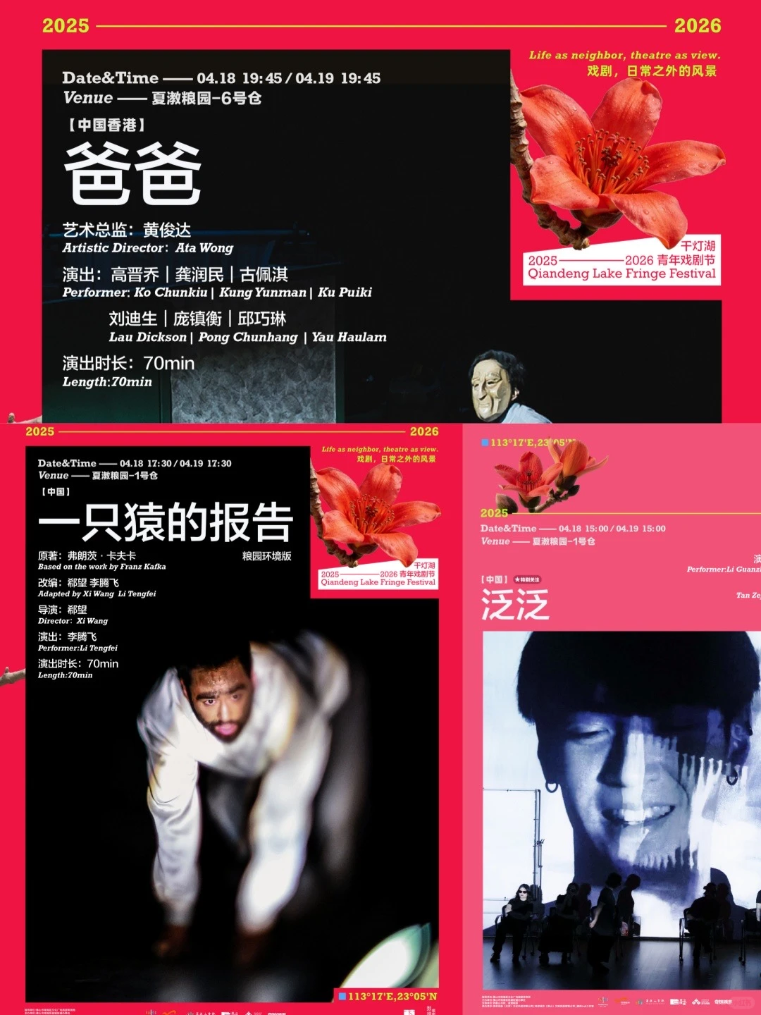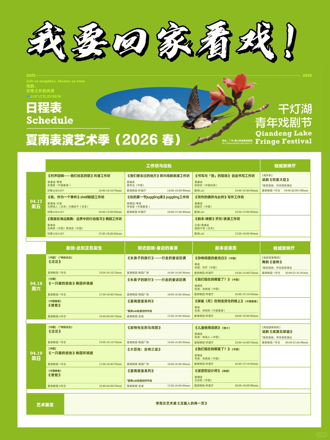 4月17日至19日,2025-2026千灯湖青年戏剧节·夏南表演艺术季(2026春)将在佛山南海桂城夏漖粮园重磅回归!所有剧目和活动在“南海奇妙游”小程序开放购买及预约。