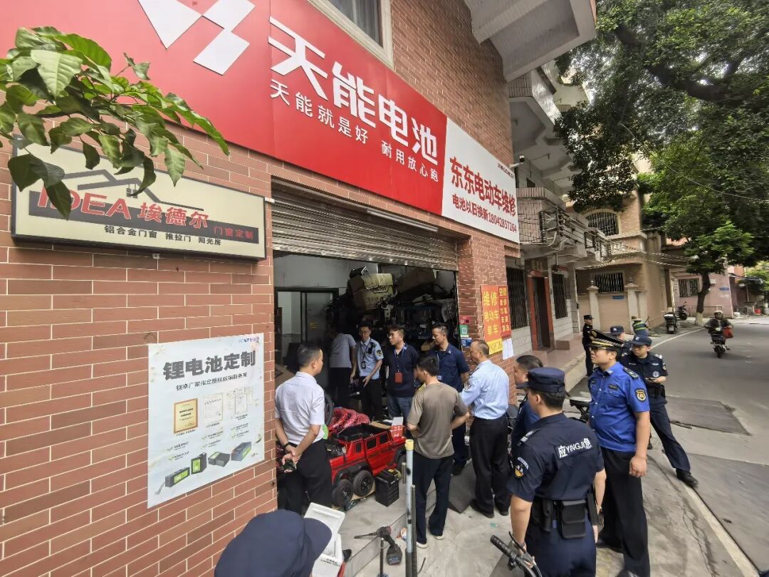 同时,各村居网格力量对藏身民宅、工业园区的维修点开展“掘地式”排查。近日,河滘村发现一家租赁民宅的电动自行车维修店存在大量堆放废旧电池、堵塞消防通道等重大安全隐患。4月8日,工作专班联合镇道安办、城南派出所、交管中队、市监、消防、执法办等7个部门出动约40人开展联合执法,当场责令经营者限期搬离并彻底清理所有违规物品,及时拆除了这颗藏在群众身边的“定时炸弹”。