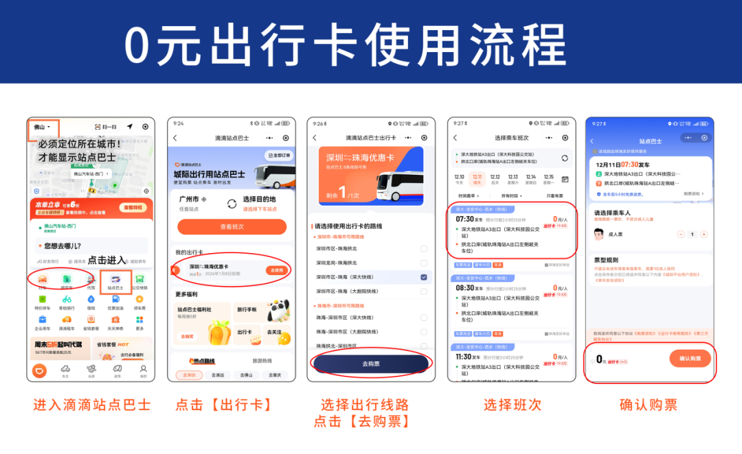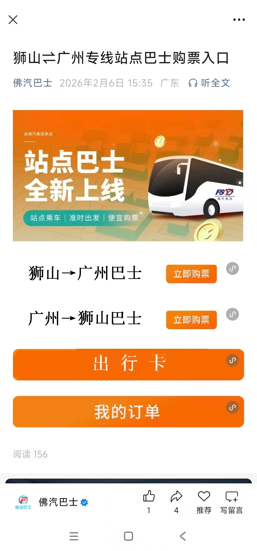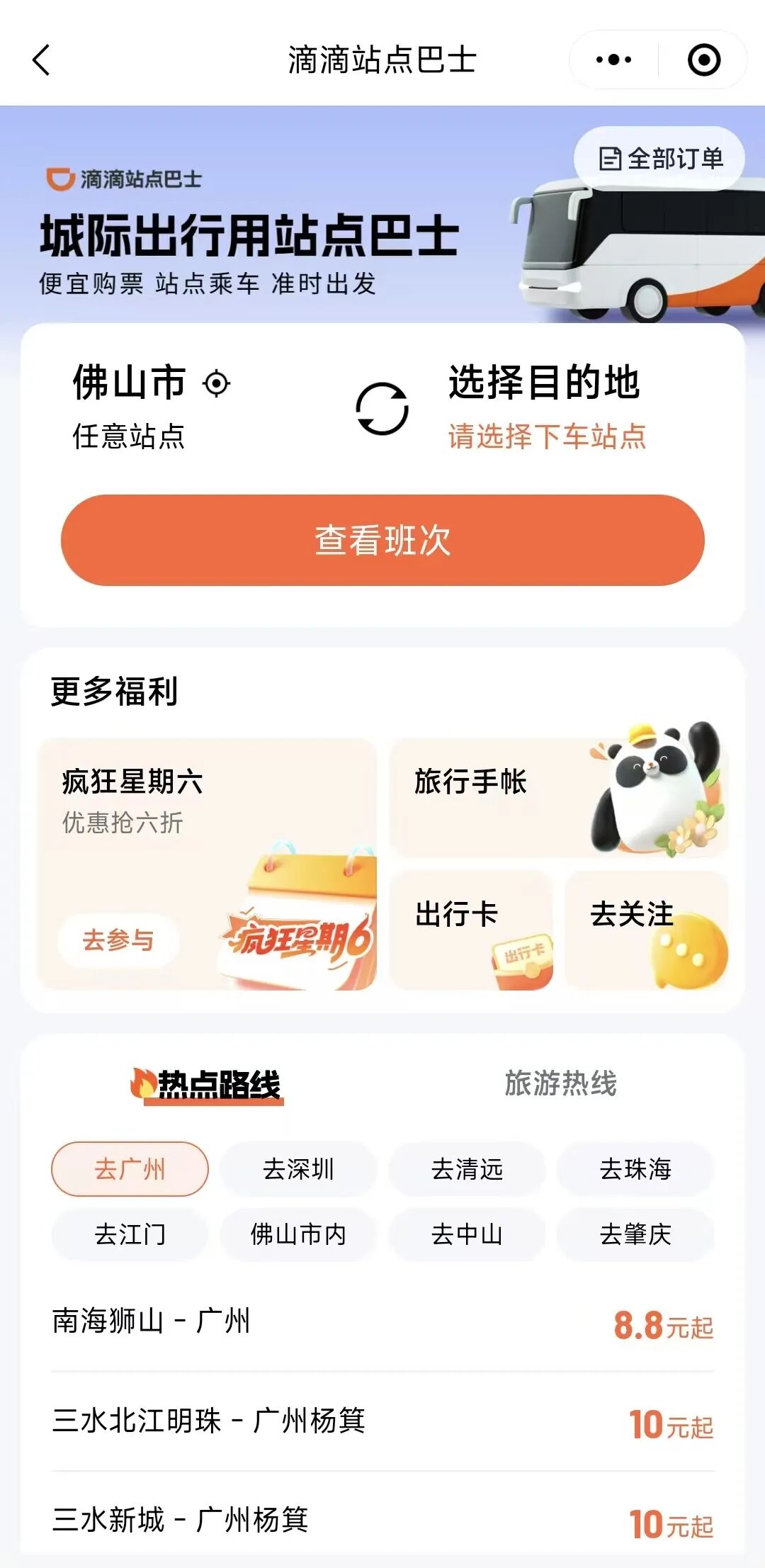 一、打开微信服务号佛汽巴士,票务服务→滴滴站点巴士购票,找到狮山至广州巴士,点击出行卡,跳转到小程序,选择站点一键订票