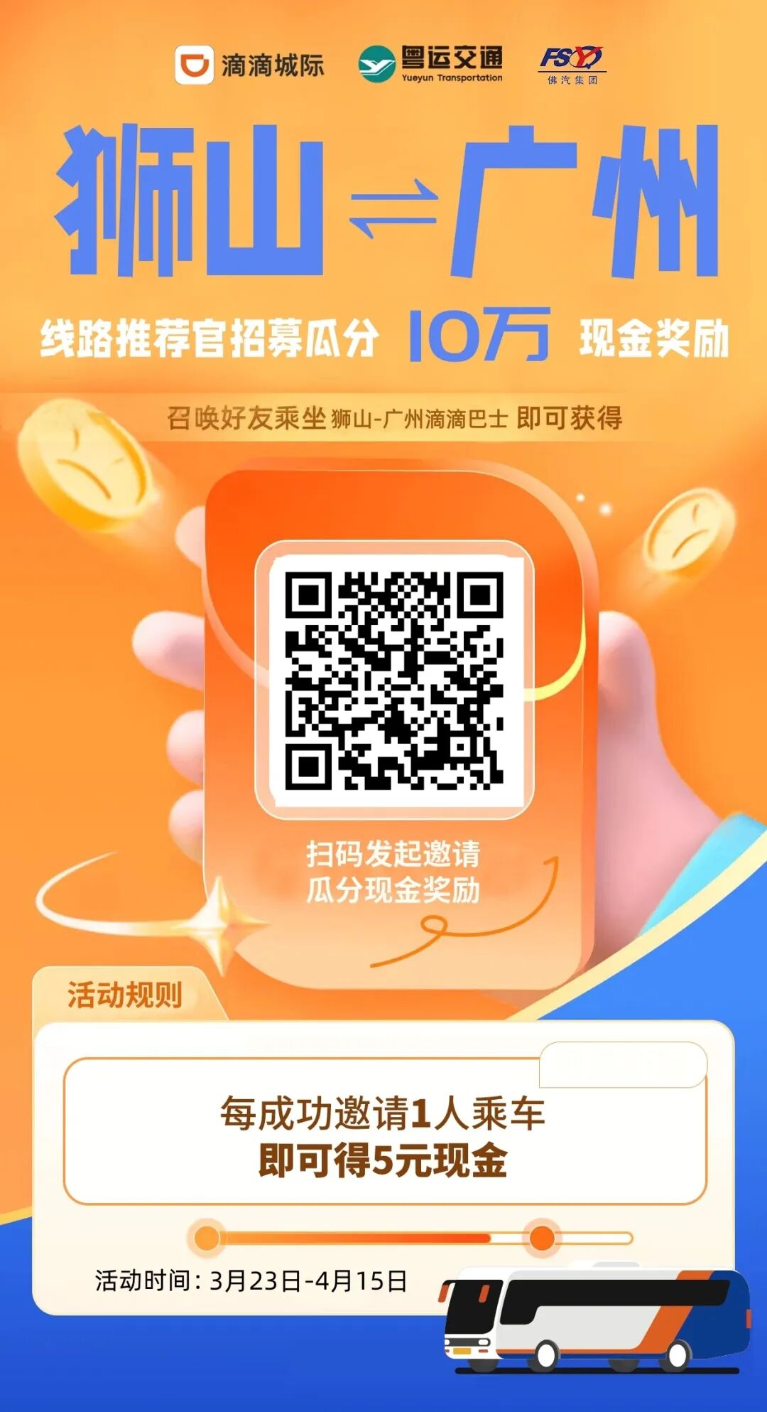 扫描下面二维码后,分享给微信好友,新用户通过您的个人专属二维码(或链接分享)购票完成乘车后,您将获得5元现金返利,直接到账!不限量,无套路,邀请狮山-广州线路新用户,即享福利!