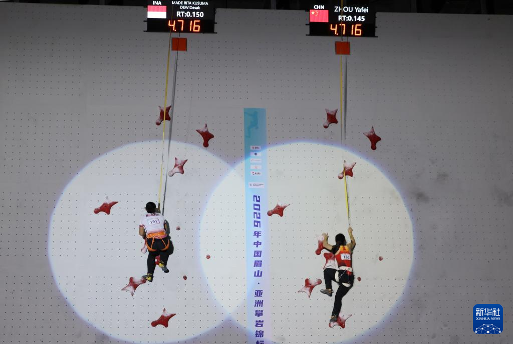 4月9日,2026年亚洲攀岩锦标赛暨名古屋亚运会资格赛女子速度决赛在四川眉山举行。
