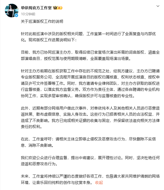 4月10日,单依纯官方工作室发布“关于巡演版权工作的说明”: